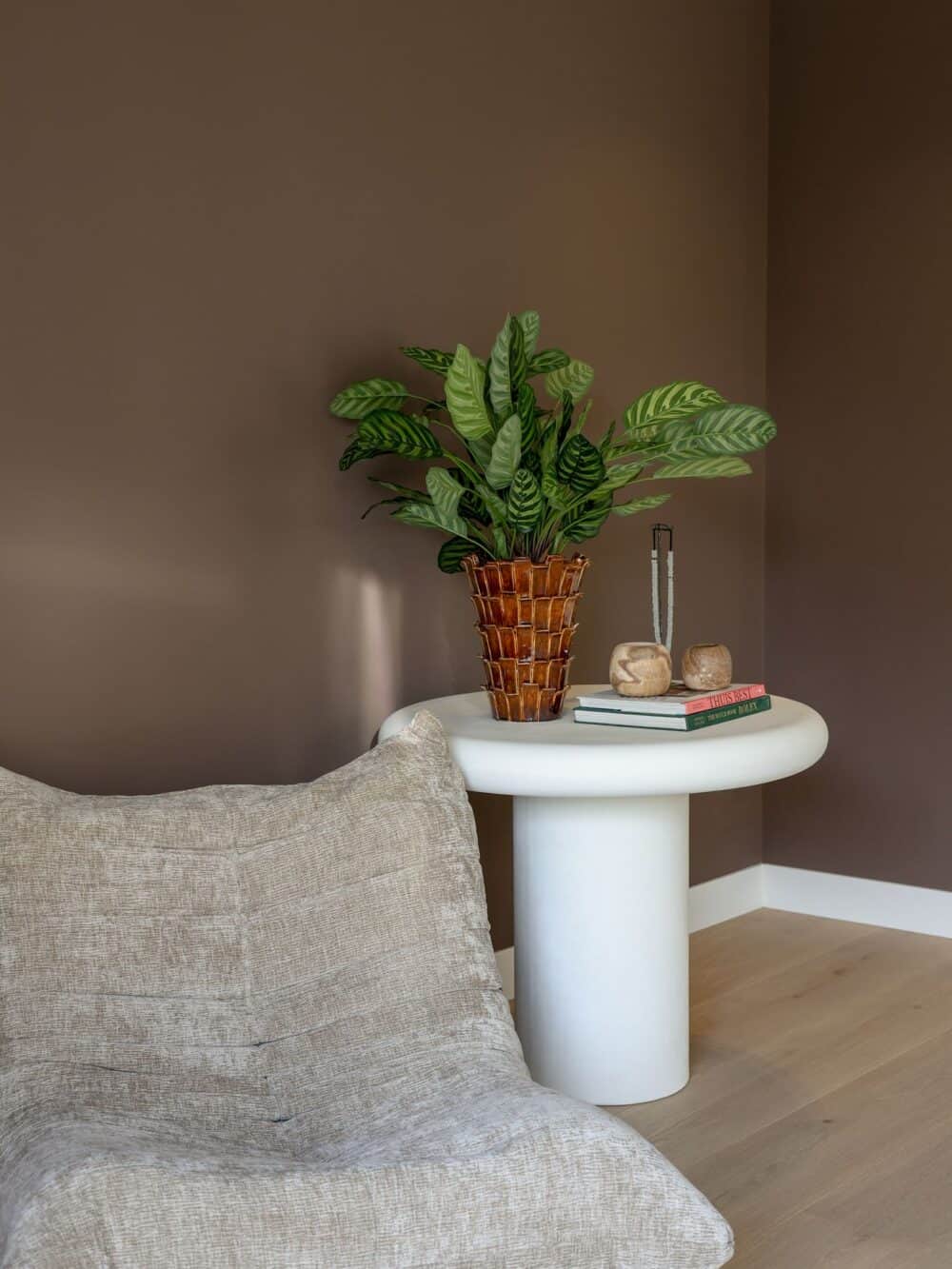 De Calathea Makoyana 78cm komt bijzonder goed tot haar recht in lichte interieurs met natuurlijke tinten. Combineer haar met zachte stoffen, aardetinten of messing accenten voor een harmonieuze uitstraling. In moderne interieurs vormt ze juist een spannend contrast met beton, glas of staal.