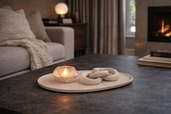 Bij Exclusief Ingericht combineren we deze dienbladen vaak met compacte zijden bloemstukken, luchtige takken of kleine kunstplanten. Denk aan een zwart metalen dienblad met een laag keramieken potje met zijden ranonkels, gecombineerd met een geurige kaars en een decoratief object. Of een goudkleurig rond dienblad met een glazen vaas met eucalyptustakken, een kunstsucculent en een handgemaakt windlichtje. De mogelijkheden zijn eindeloos, zolang er balans is in kleur, vorm en hoogte.