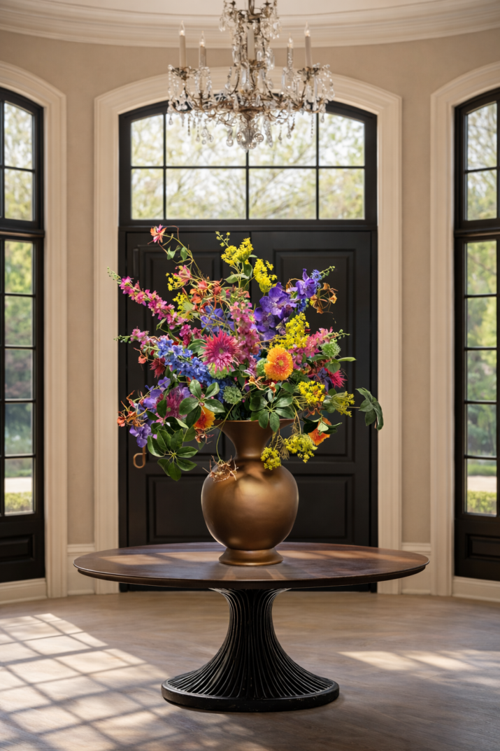 Plaats je dit grote bloemstuk in een minimalistisch interieur, dan ontstaat direct spanning tussen strakke lijnen en organische vormen. In een hotel chic setting versterkt het de luxe sfeer door het spel van kleur en glans. In een warm familiehuis brengt het levendigheid zonder onderhoud.