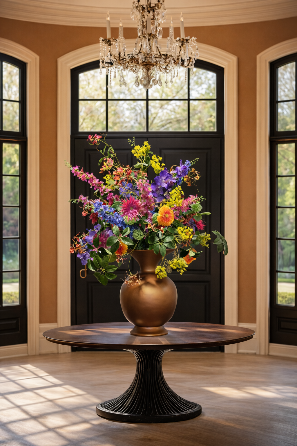 Stijltip voor een royale entree: plaats het bloemstuk iets uit het midden op een ruime vloeroppervlakte zodat het kan ademen. Combineer met een wand in een warme neutrale tint zodat de brons- en bonte kleuren naar voren komen. Werk met zachte verlichting die het bloemstuk van onderaf of zijdelings aanlicht voor extra diepte.
