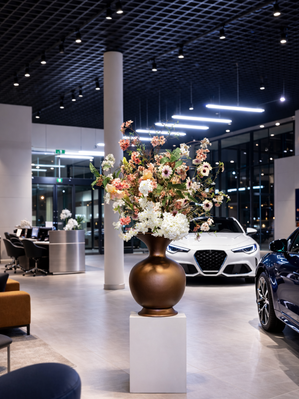 Je hebt bij ons de mogelijkheid om een bloemstuk volledig op maat samen te stellen. Kies je liever voor iets meer pastel of juist meer brons? Wil je de pot in een andere tint of structuur? In de showroom kun je verschillende potten en bloemcombinaties fysiek bekijken en kopen. Onze adviseurs denken met je mee over verhoudingen, hoogte en plaatsing.