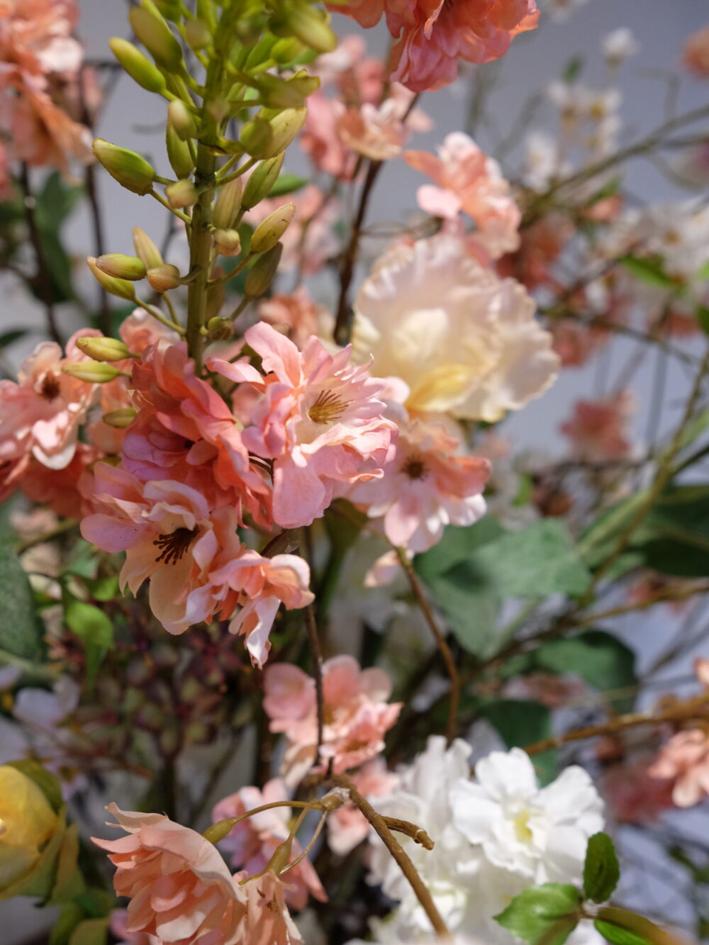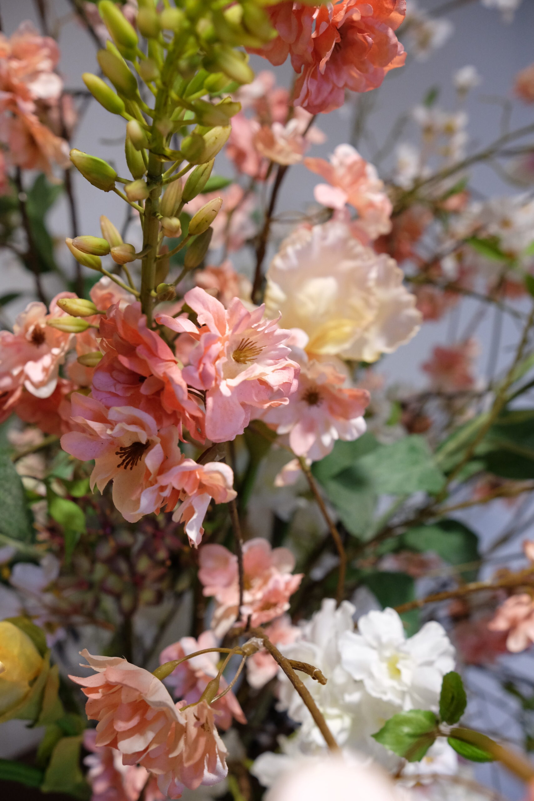In een omvangrijk bloemstuk is detail bepalend. Elk element moet kloppen. De zijden bloemen hebben een zachte textuur en een natuurlijke valling. Hierdoor ontstaat diepte in het arrangement en vermijd je een massieve uitstraling. De bronsaccenten geven warmte zonder zwaar te worden, terwijl de pastelbloemen zorgen voor balans.