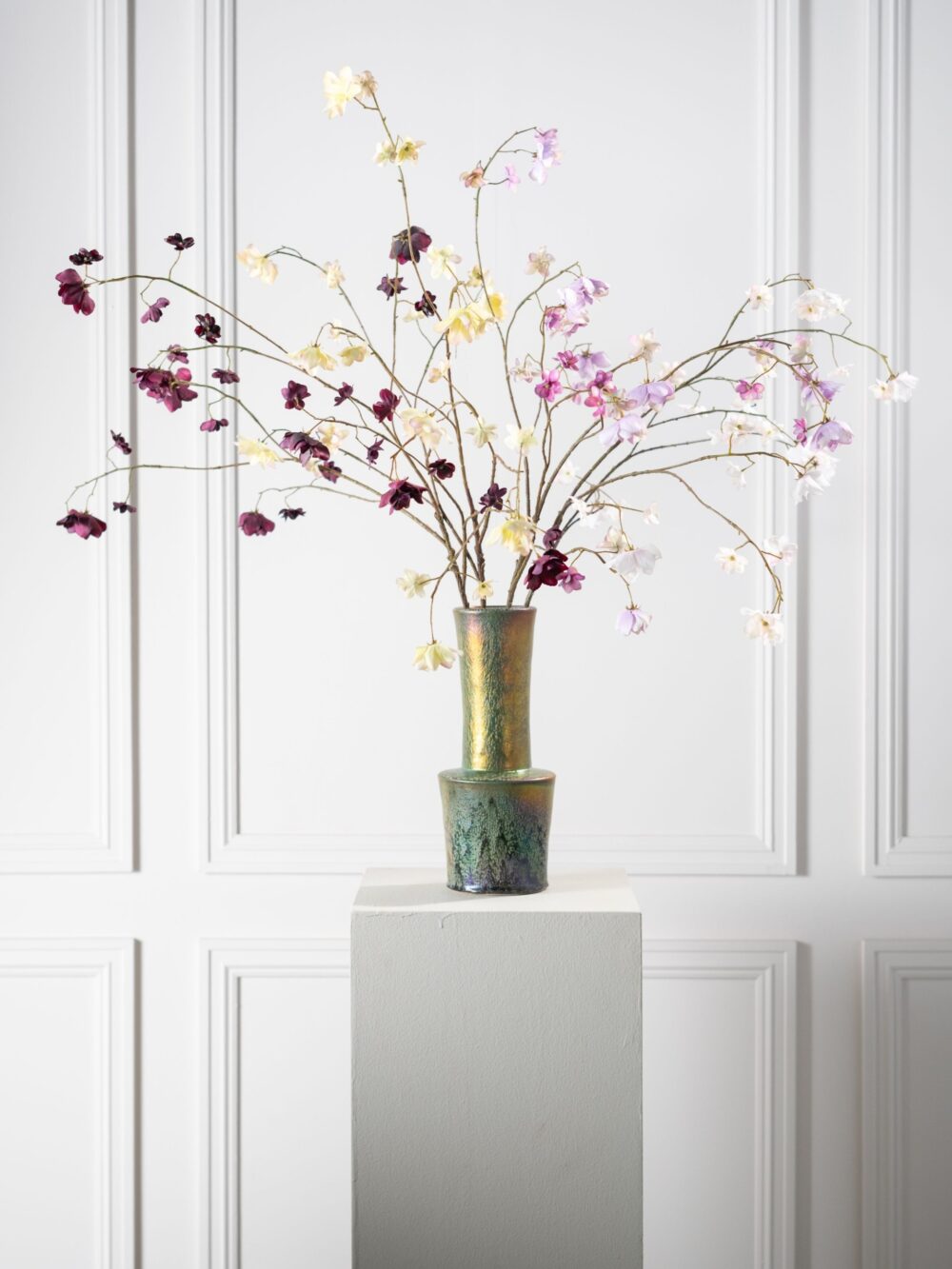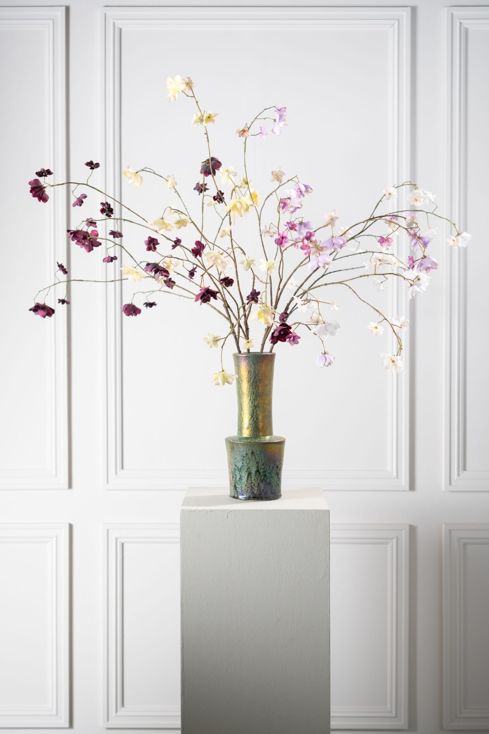 De lengte van 105 cm geeft je vrijheid in styling. Laat de steel iets doorbuigen voor een natuurlijke vorm of plaats meerdere takken bij elkaar voor een rijk boeket met volume. Door te werken met verschillende hoogtes creëer je diepte. Eén enkele tak in een smalle hoge vaas zorgt voor rust, terwijl een combinatie met andere zijden kunstbloemen een voller arrangement vormt.