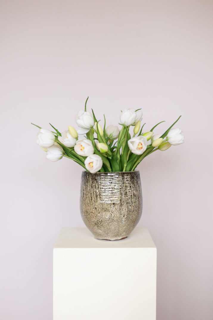 Een interieur krijgt pas echt karakter wanneer verschillende lagen samenkomen. Denk aan een grote vaas op een tafel, een sculptuur op een kast of een bijzonder object op een sidetable. Het Kunsttulpenboeket wit 30 tulpen werkt perfect als onderdeel van zo’n compositie. Door het boeket te combineren met materialen zoals glas, natuursteen of keramiek ontstaat een rijke en verfijnde sfeer.