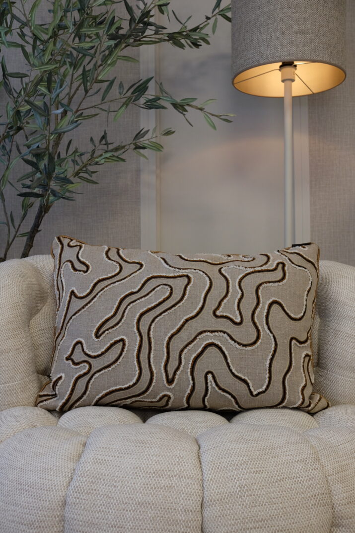 Ook buiten maken de kussens indruk. Als stijlvolle buitenkussens zijn ze ideaal voor een luxe loungehoek aan het zwembad, een overdekt terras of een patio met natuurlijke materialen. De verfijnde uitstraling zorgt voor een harmonieuze overgang tussen binnen en buiten – perfect voor een villa met een high-end look.