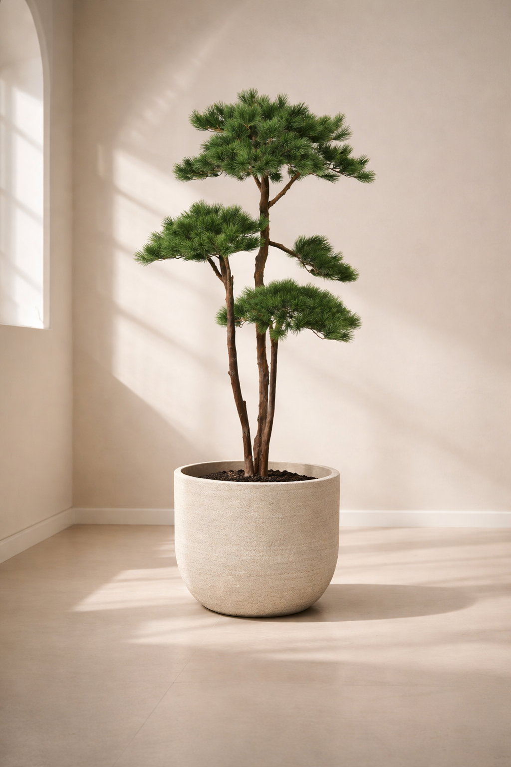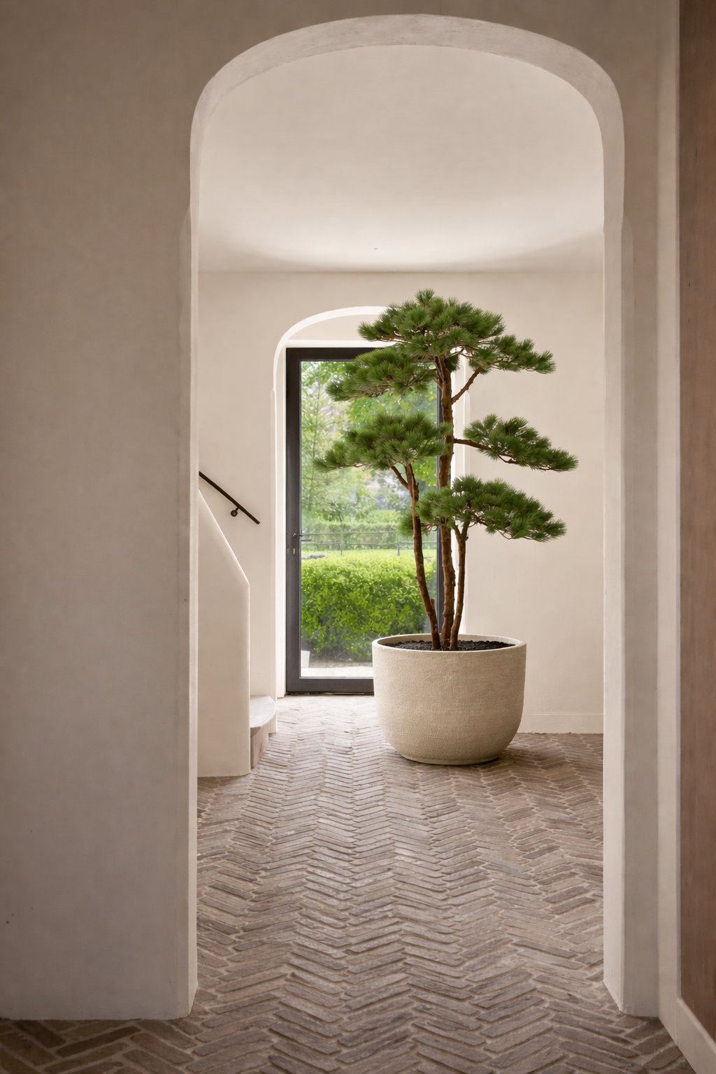 Veel klanten combineren de Pinus bonsai kunstboom met rustige materialen zoals travertin, licht hout en zachte stoffen. Ook in een modern interieur met beton en staal werkt deze boom goed omdat de natuurlijke vorm warmte toevoegt.