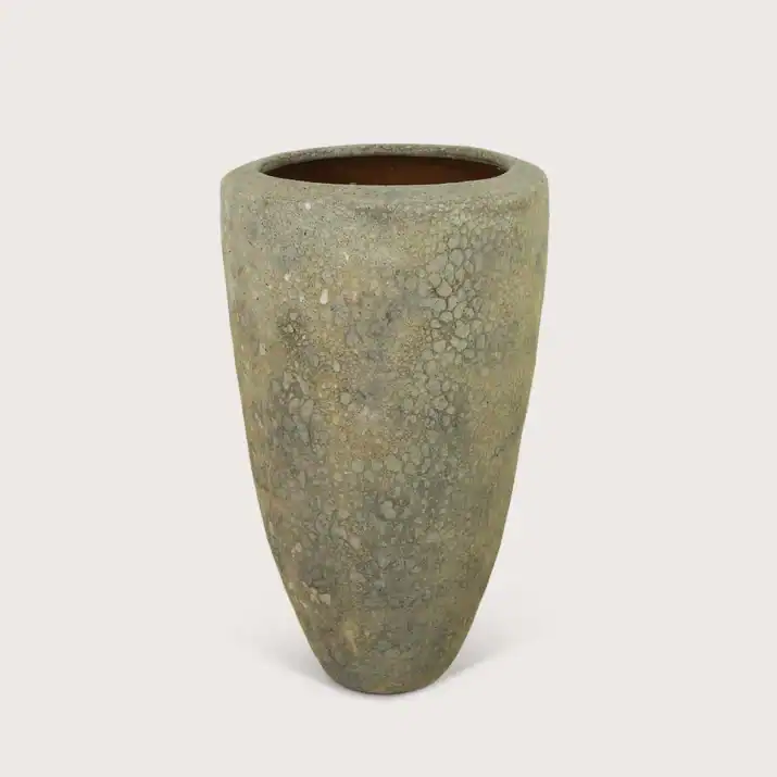 Het ontwerp kenmerkt zich door een ruwe, natuurlijke textuur met aardse tinten, wat zorgt voor een stoere, organische sfeer. De pot past goed bij een Japandi- of industrieel interieur.