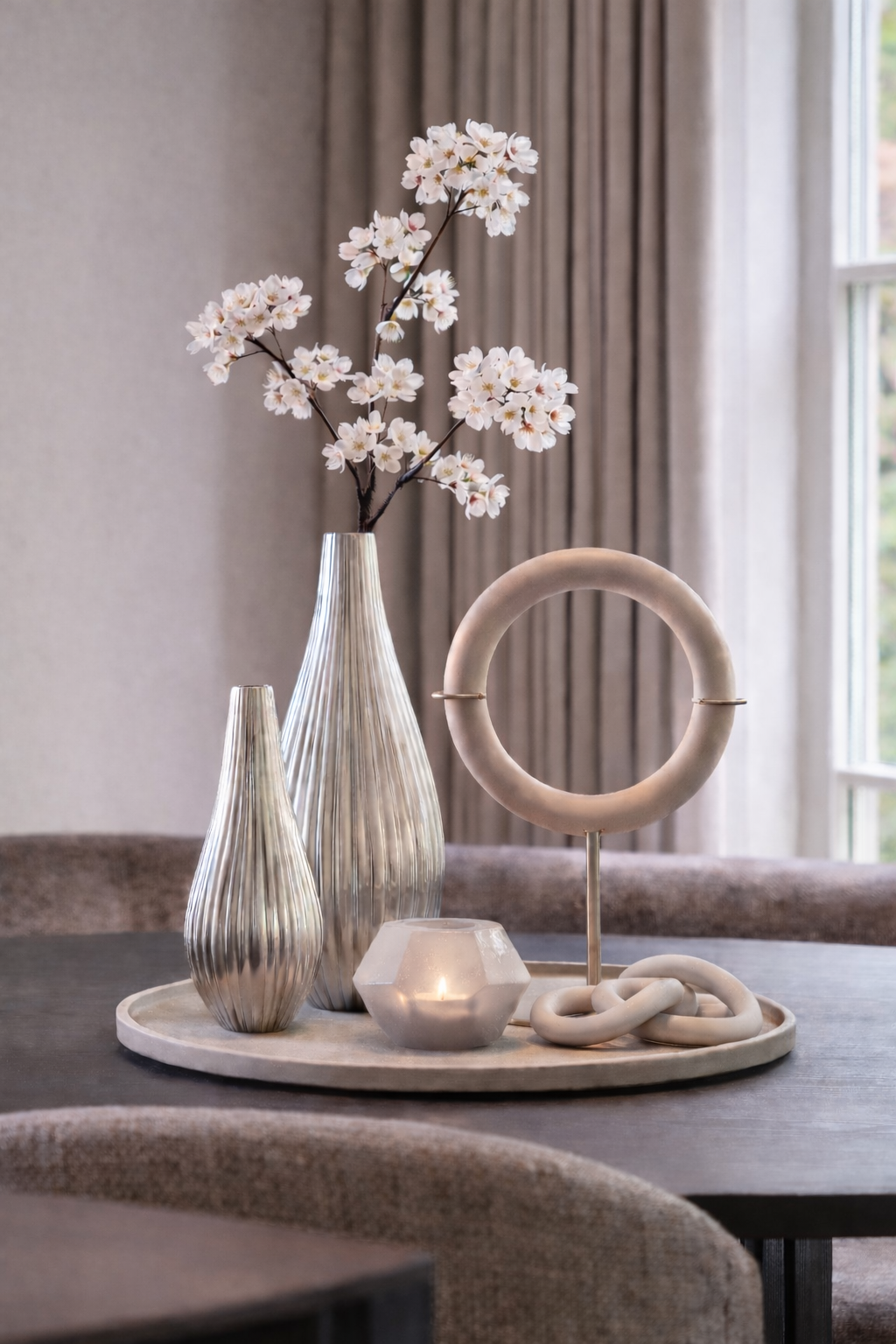 De oud roze tint laat zich moeiteloos combineren met neutrale kleuren zoals beige, taupe en crème. In een interieur met donkere accenten, zoals zwart of diepbruin hout, ontstaat een spannend contrast. In een licht interieur zorgt de bloesemtak voor een verfijnde ton-sur-ton uitstraling. Door te spelen met verschillende hoogtes in vazen creëer je een dynamisch geheel dat rust uitstraalt.