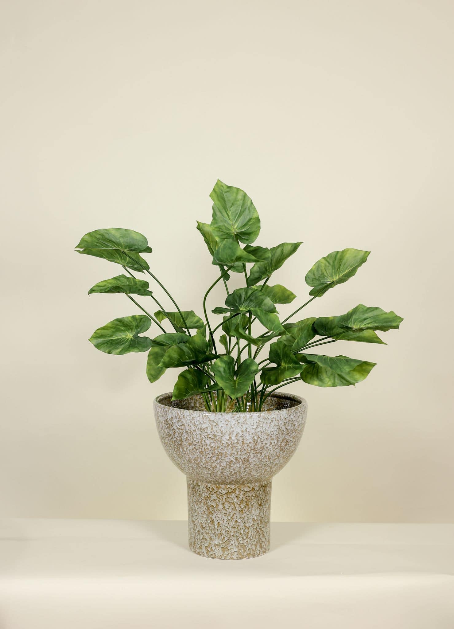 Deze kunstplant past moeiteloos in verschillende interieurstijlen. In een modern interieur vormt de Caladium een krachtig statement met zijn contrasterende bladkleuren. In klassieke of botanische settings brengt hij juist rust. Door de compacte hoogte van 70 cm is hij ideaal voor tafels, kasten of als decoratief accent in een entree of badkamer.