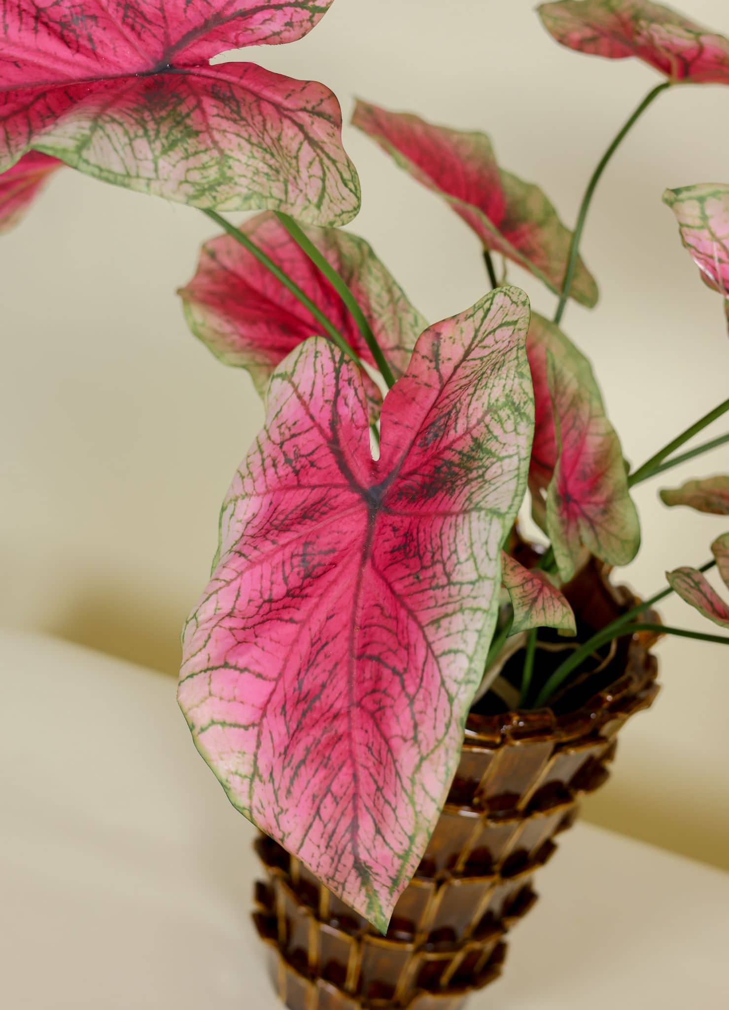 De winkel laat ook zien hoe kunstplanten ruimtewerking beïnvloeden. Je ontdekt hoe je met hoogteverschillen balans creëert, hoe bladstructuren bijdragen aan ritme en hoe een plant als deze Caladium perfect werkt in kleine en middelgrote ruimtes. Dit helpt je om te bepalen waar in huis de plant het beste tot zijn recht komt.