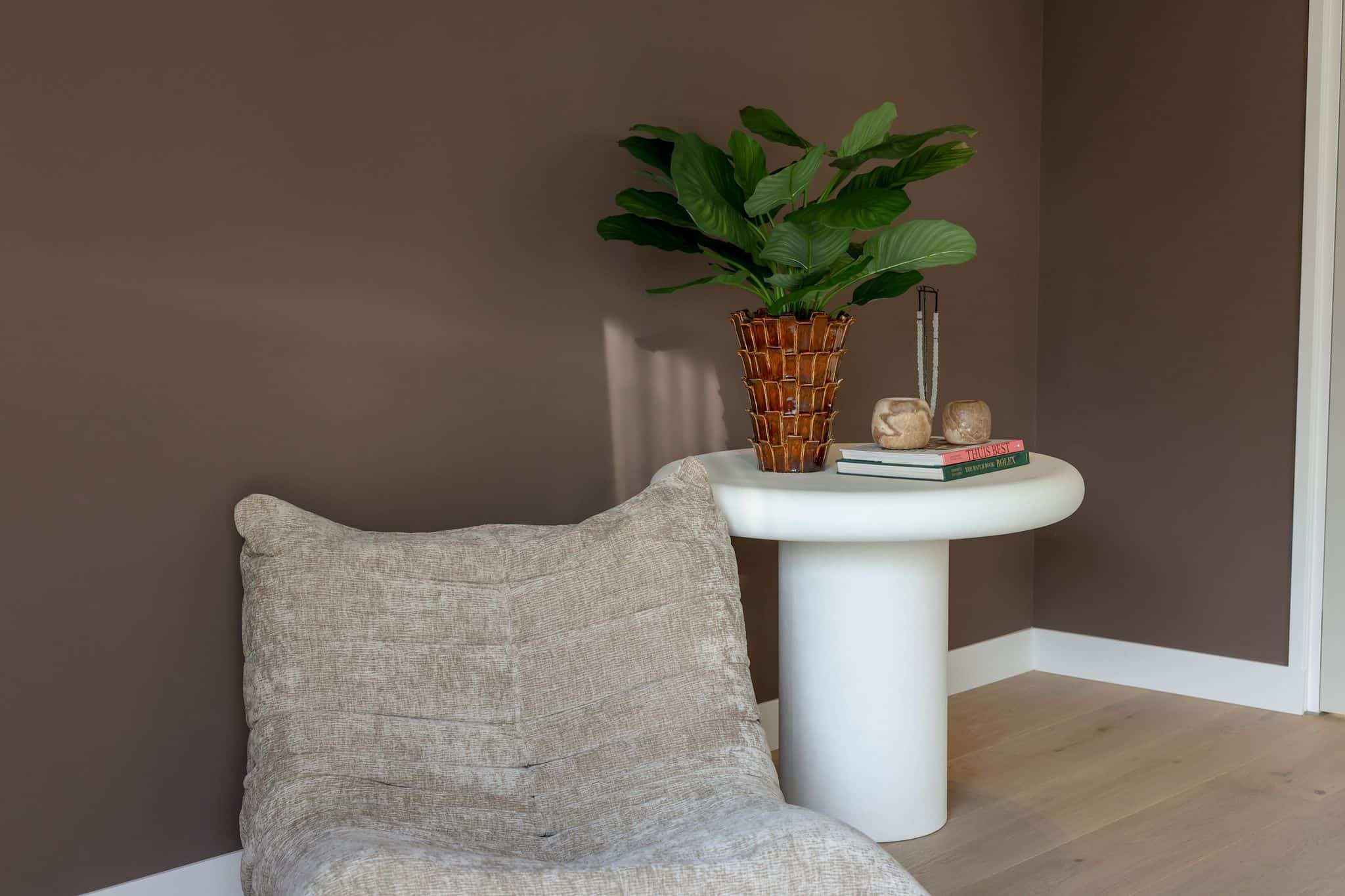 Een diepe, rustige tint werkt het sterkst. Denk aan aarde-, hout- of donkere steenkleuren die aansluiten bij exclusieve interieurs.