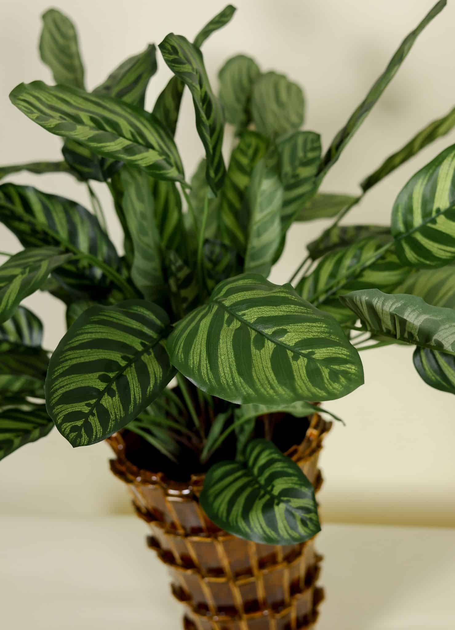 Deze kunstplant is zorgvuldig met de hand samengesteld. De bladeren tonen het kenmerkende patroon van licht- en donkergroene nerven, realistisch nagemaakt met subtiele kleurovergangen en een matte afwerking. De compacte hoogte van 78 cm maakt deze Calathea ideaal voor dressoirs, bijzettafels of als levendige aanvulling in grotere groene composities met bijvoorbeeld de kunstboom Pittosporum 250cm .