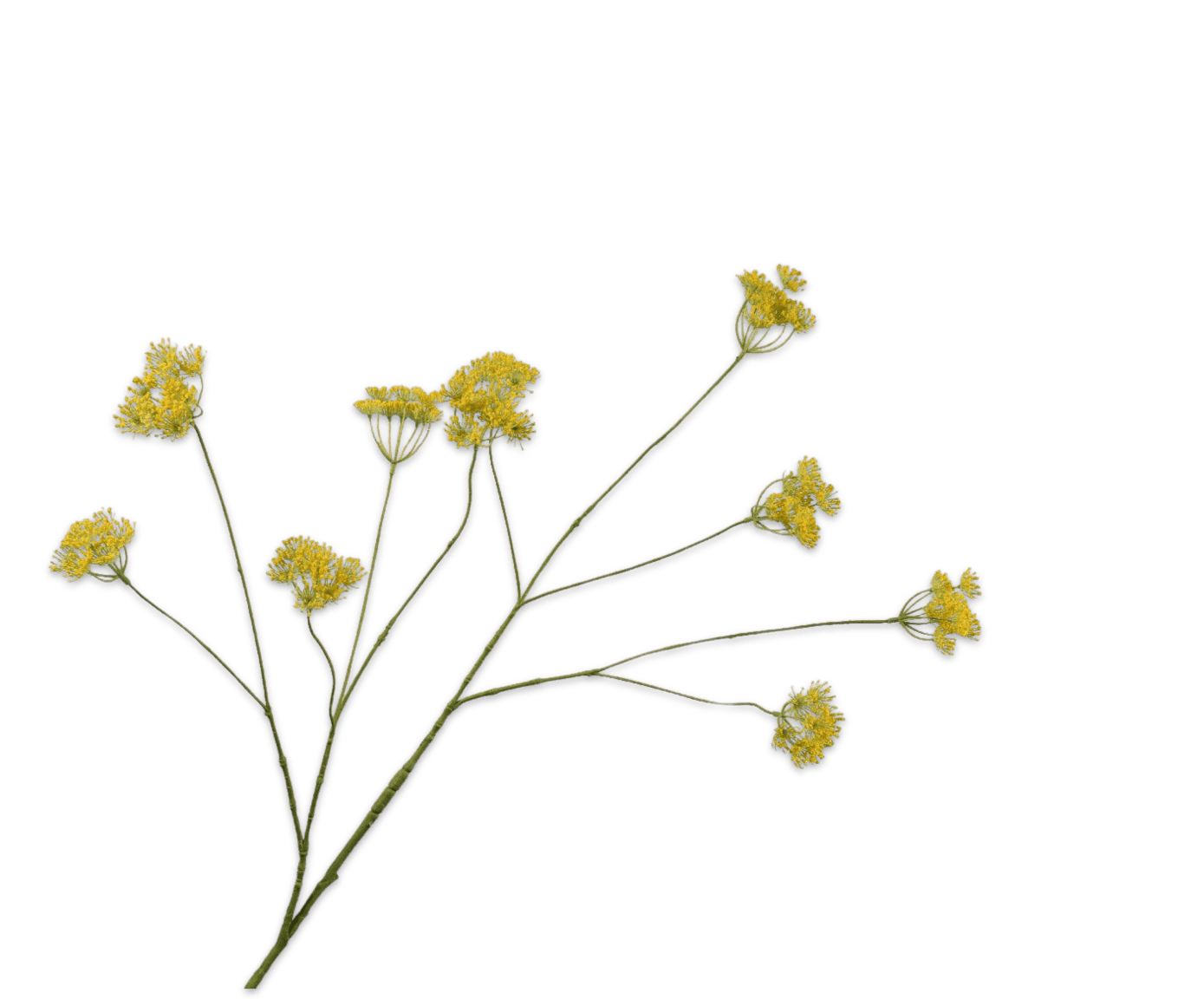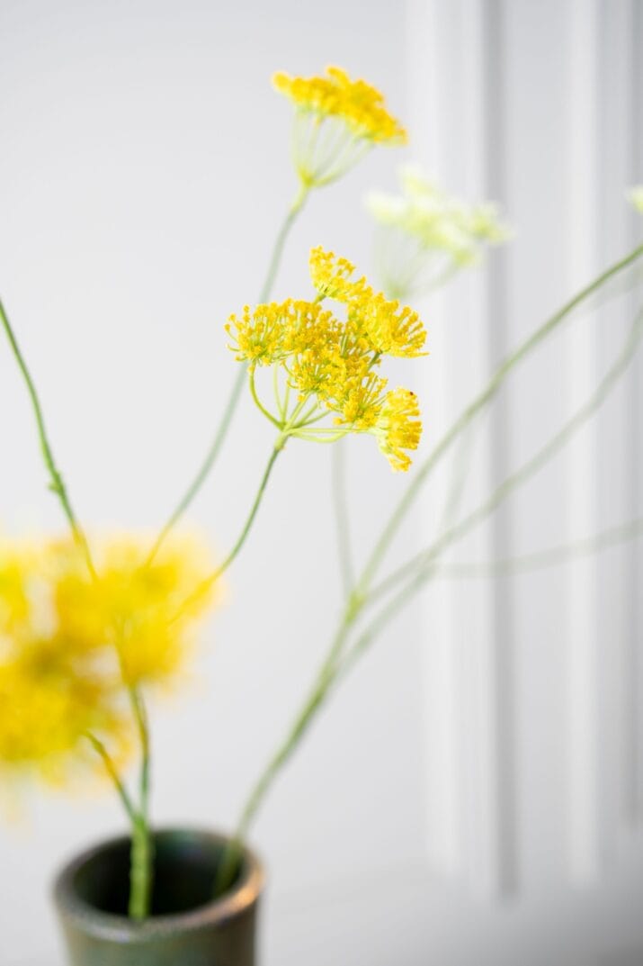 De warme gele tint is karaktervol, zonder fel te zijn. Ze sluit prachtig aan bij natuurlijke materialen en aardse kleuren. Denk aan linnen, hout, keramiek en zachte grijstinten – de dilletak voegt een zonnetje toe aan het interieur, zonder dominant te zijn. De organische vorm en verfijnde structuur zorgen voor beweging, ritme en lichtheid in elke compositie. Een enkele tak geeft al sfeer, maar in combinatie met andere zijden bloemen uit onze Silk-ka collectie ontstaat er een rijk en gebalanceerd geheel.