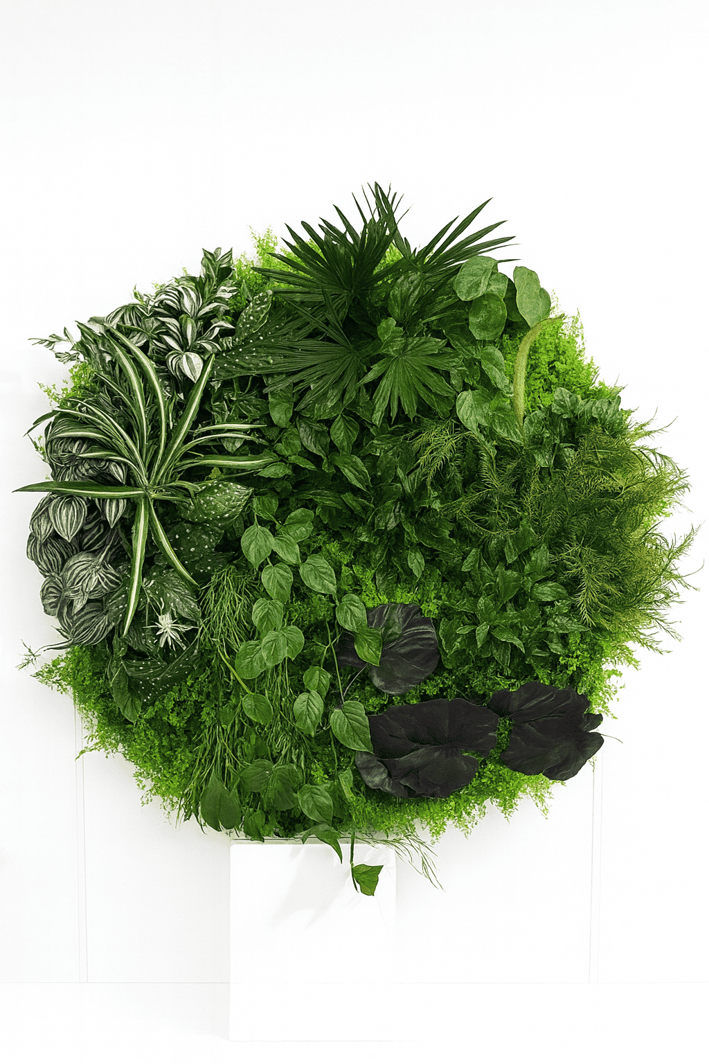 Het bijzondere aan deze Greencircle is de manier waarop het product een leeg vlak verandert in een krachtig element in de ruimte. Waar een traditionele wanddecoratie vaak afhankelijk is van kleur en materiaal, werkt dit groene schilderij vooral door vorm, structuur en subtiele diepte. Je brengt een groene laag in het interieur die constant fris oogt en nooit vraagt om water, licht of verzorging. De handgemaakte afwerking zorgt voor een natuurlijke opbouw met variatie in bladstructuren, waardoor het oppervlak levend oogt zonder dat je last hebt van onderhoud of allergieën. Juist in minimalistische interieurs creëert dit groene wandobject een contrast dat rust geeft in plaats van drukte. Het voegt groen toe zonder dat het fysiek ruimte inneemt, waardoor het ook ideaal is voor compacte stadswoningen of smalle gangen.
