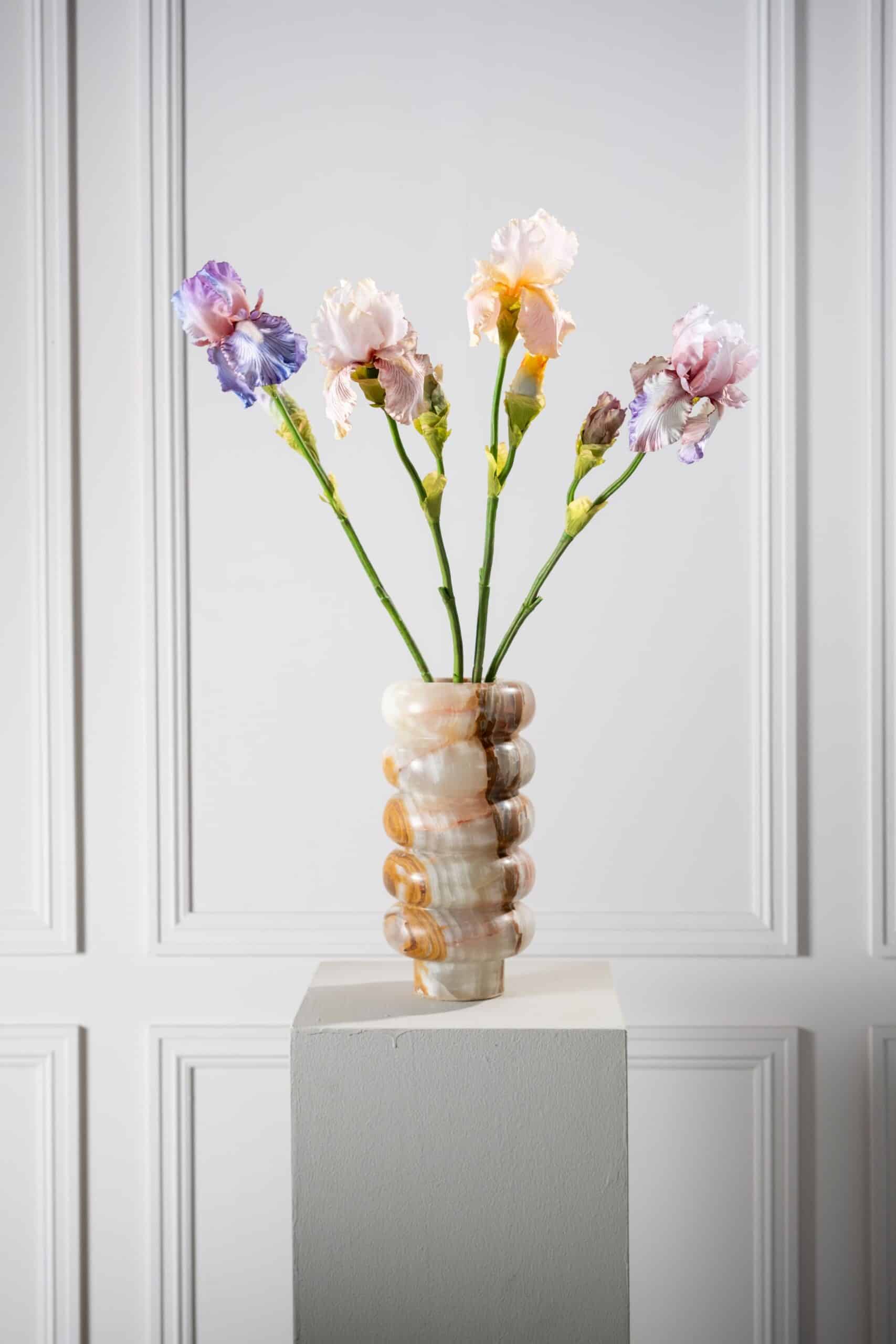 Ze is het soort bloem dat niet probeert te overheersen, maar juist een rustige sfeer versterkt. De bloemblaadjes openen zich met een verfijnde beweging naar buiten toe, als een handgebaar dat een ruimte verwelkomt. De steel is slank, met een subtiele lijn, en brengt balans in elke compositie. Dankzij haar natuurlijke kleur komt deze Iris bijzonder goed tot haar recht in Scandinavische of Japandi interieurs, maar ook als verzachtend element in industriële settings waar staal en beton overheersen.