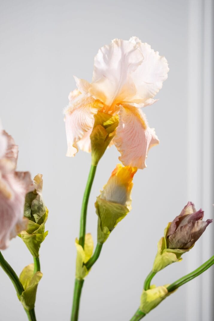 Deze Iris tak perzik is onderdeel van de exclusieve collectie van Silk-ka – een merk dat verfijning en natuurgetrouwheid tot kern heeft verheven. Elk bloemblaadje toont een subtiel kleurverloop van lichtroze tot zacht oranje. De steel is slank, maar stevig, en buigt licht mee zonder vorm te verliezen. Deze aandacht voor detail zorgt ervoor dat de bloem nauwelijks van echt te onderscheiden is.