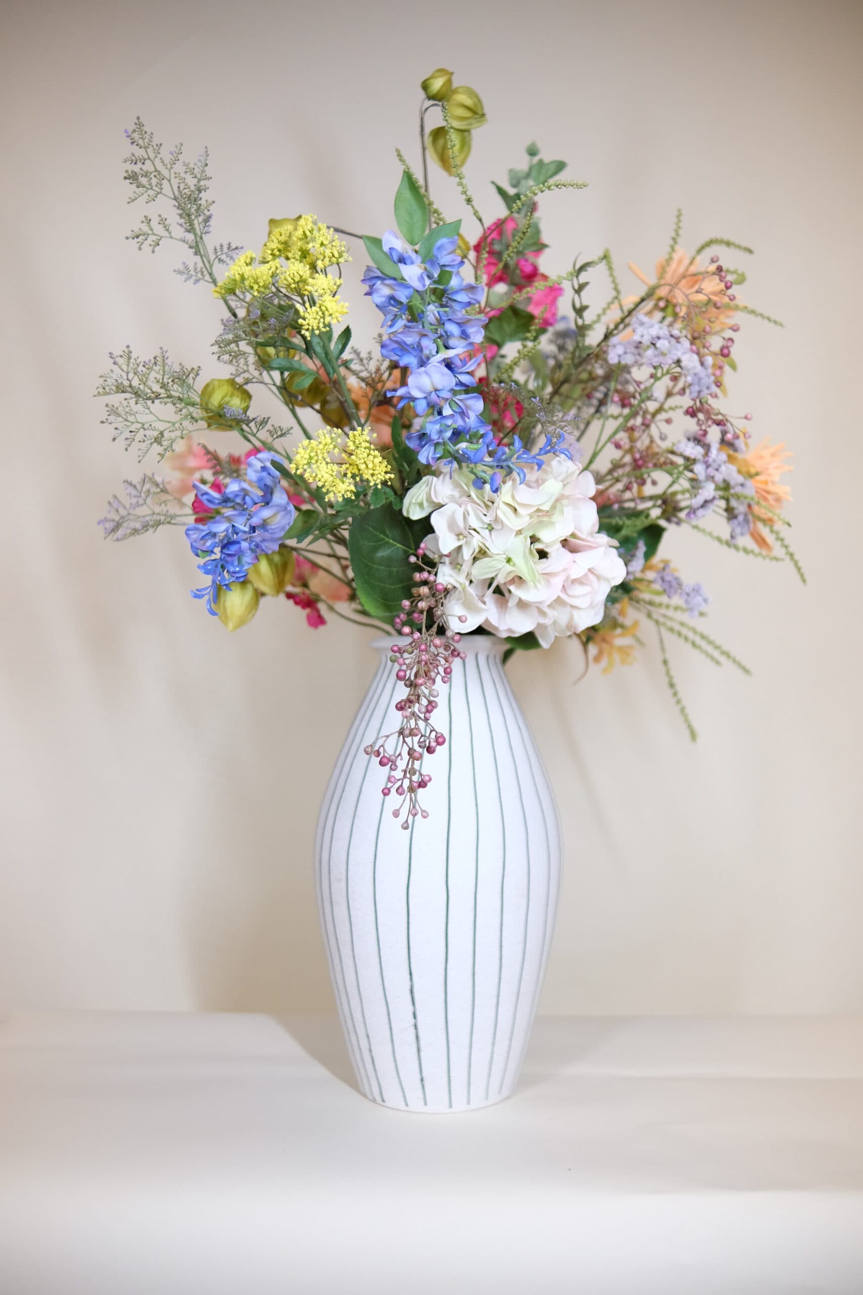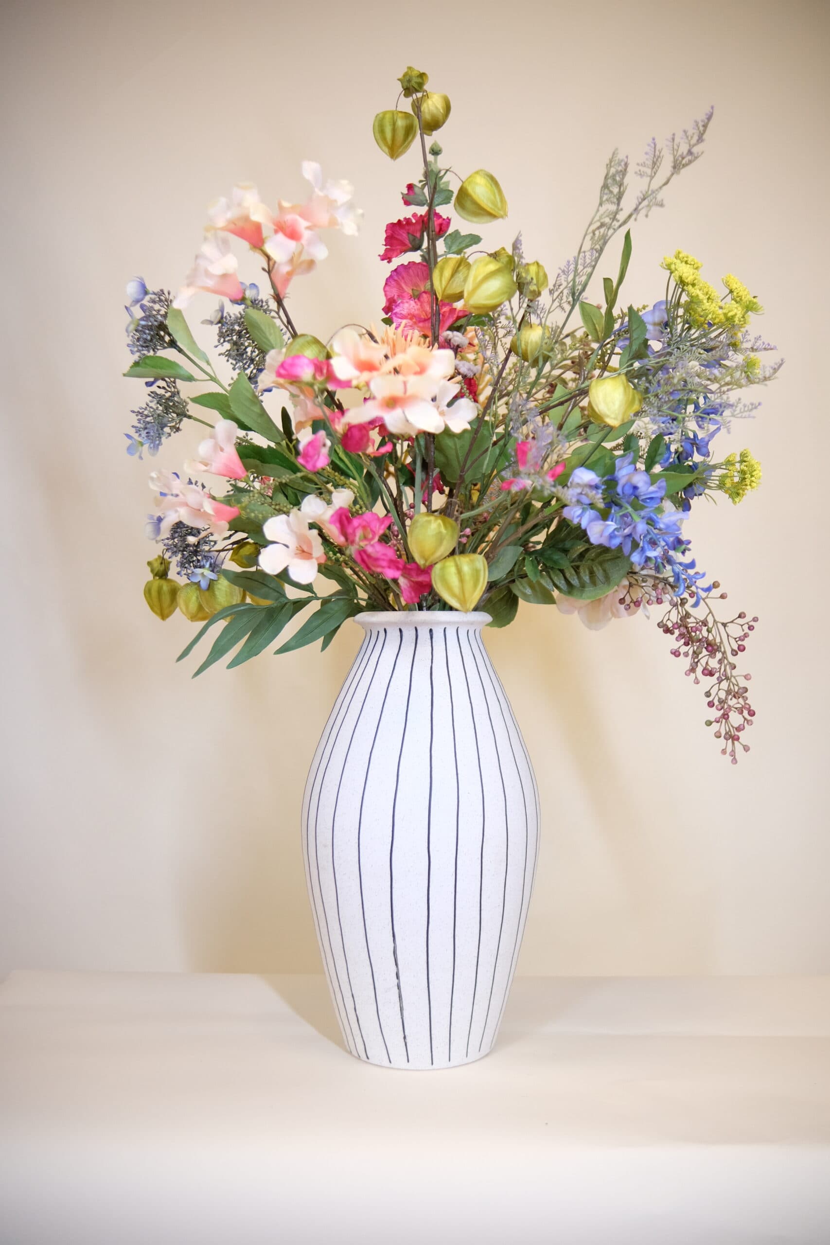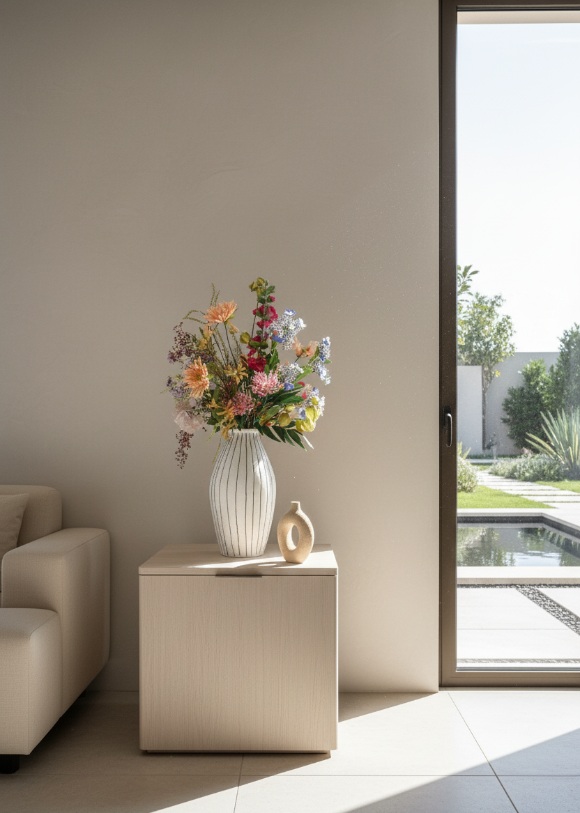 Het Forever Bloom Boeket komt het mooist tot zijn recht in een stijlvolle vaas van glas, keramiek of aardewerk. Kies voor neutrale tinten zoals wit, zand of grijs om de compositie elegant en rustig te laten spreken.