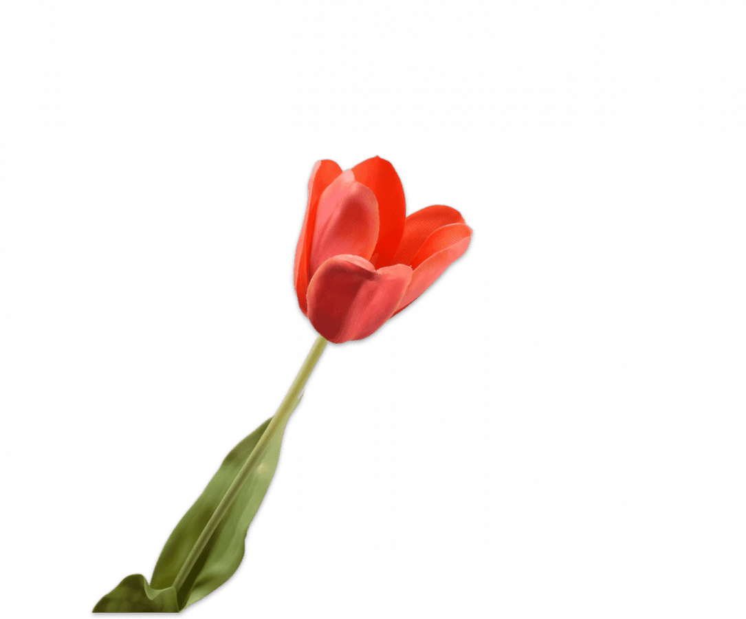 Wat deze kunsttulp bijzonder maakt, is hoe realistisch ze oogt en aanvoelt. De steel buigt subtiel, net als bij een vers gesneden bloem, en de bloembladen hebben een textuur die het licht op een natuurlijke manier vangt. Het kleurverloop is verfijnd: van een zachte oranje gloed aan de basis naar een intens rood aan de randen. Dit zorgt voor diepte en dynamiek, waardoor deze kunsttulp een levendig en warm element in je interieur vormt. Ideaal als enkele bloem in een vaas of als onderdeel van een groter arrangement.