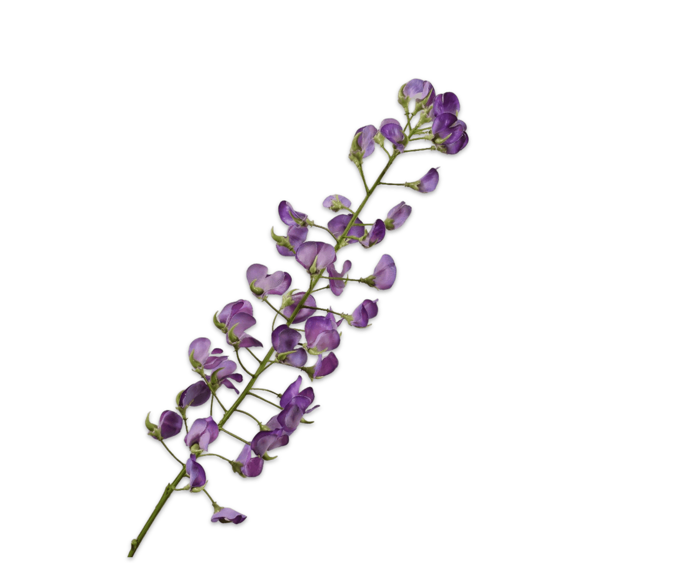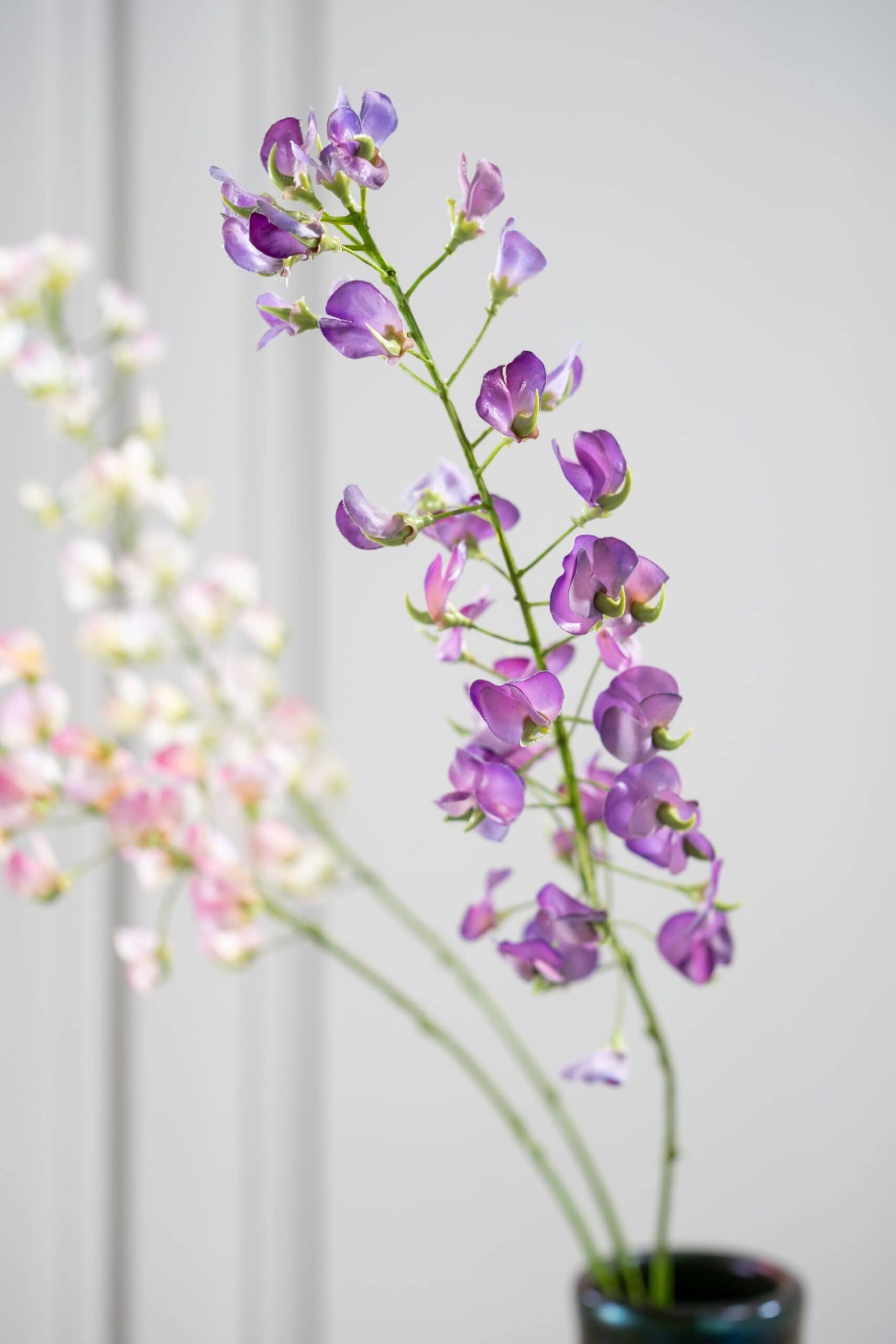 Silk-ka heeft met de Lathyrus steel paars 86 cm een zijden bloem ontwikkeld die in elk detail overtuigt. De bloemblaadjes zijn fijntjes gevormd, met licht gekrulde randen en subtiele kleurverlopen van lavendel naar diep violet. De tak is soepel, licht buigzaam en volgt een natuurlijke lijn. Elke bloem, elk knopje en elk blad is natuurgetrouw vormgegeven, waardoor deze lathyrus nauwelijks van echt te onderscheiden is.