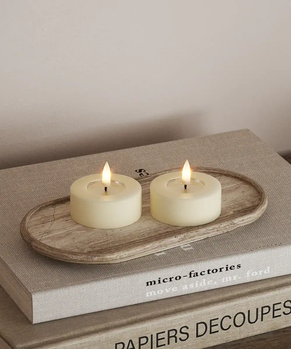 Plaats een set van drie Led kunstkaars waxine 6 X 4,5 in verschillende kleine glaasjes of windlichten. Combineer dit met enkele losse zijden bloemen van Silk-ka op een dienblad van keramiek of hout. Voeg een klein kunstplantje toe voor balans. Zo creëer je een sfeervol centerpiece voor op de salontafel, side table of badkamerplank.