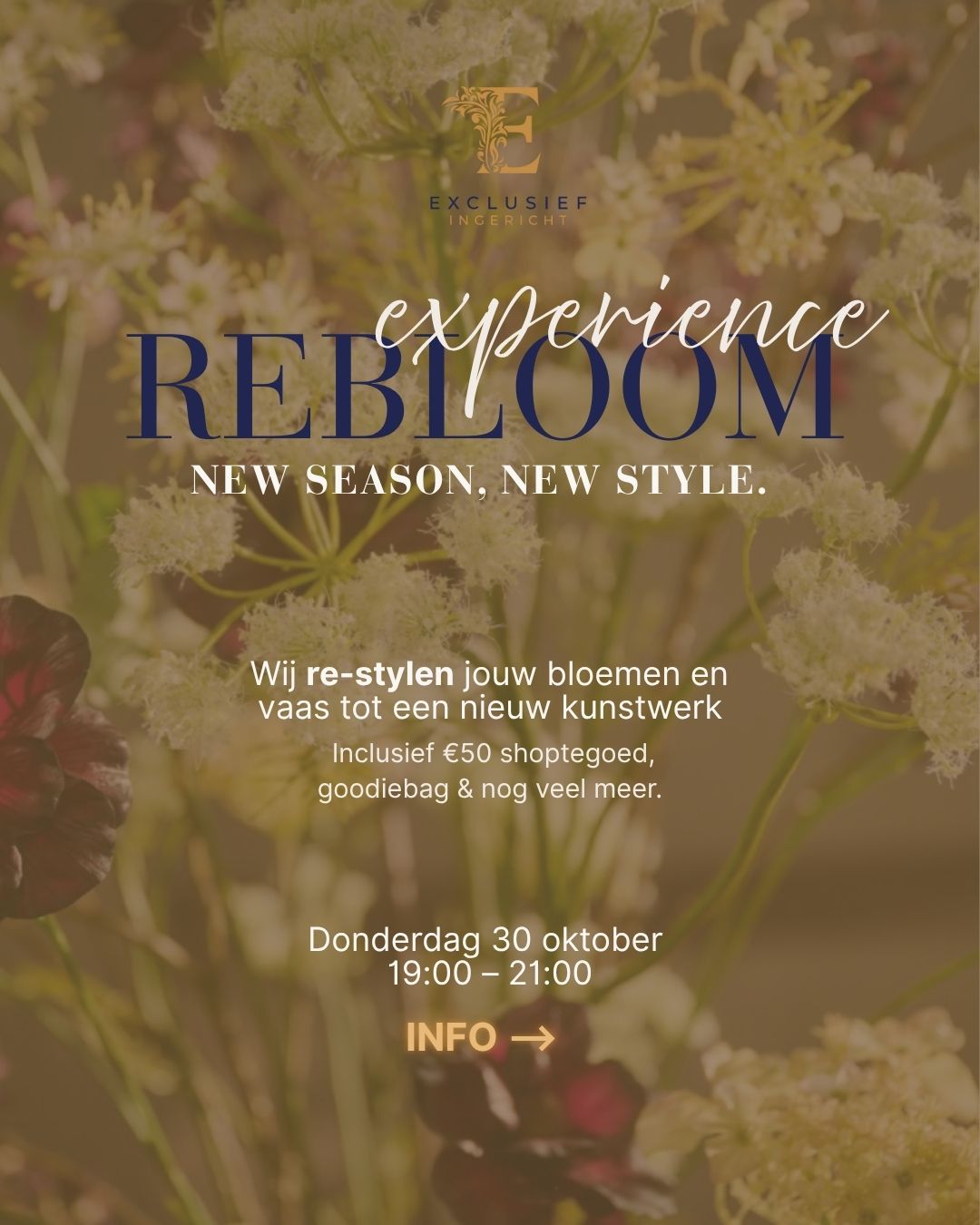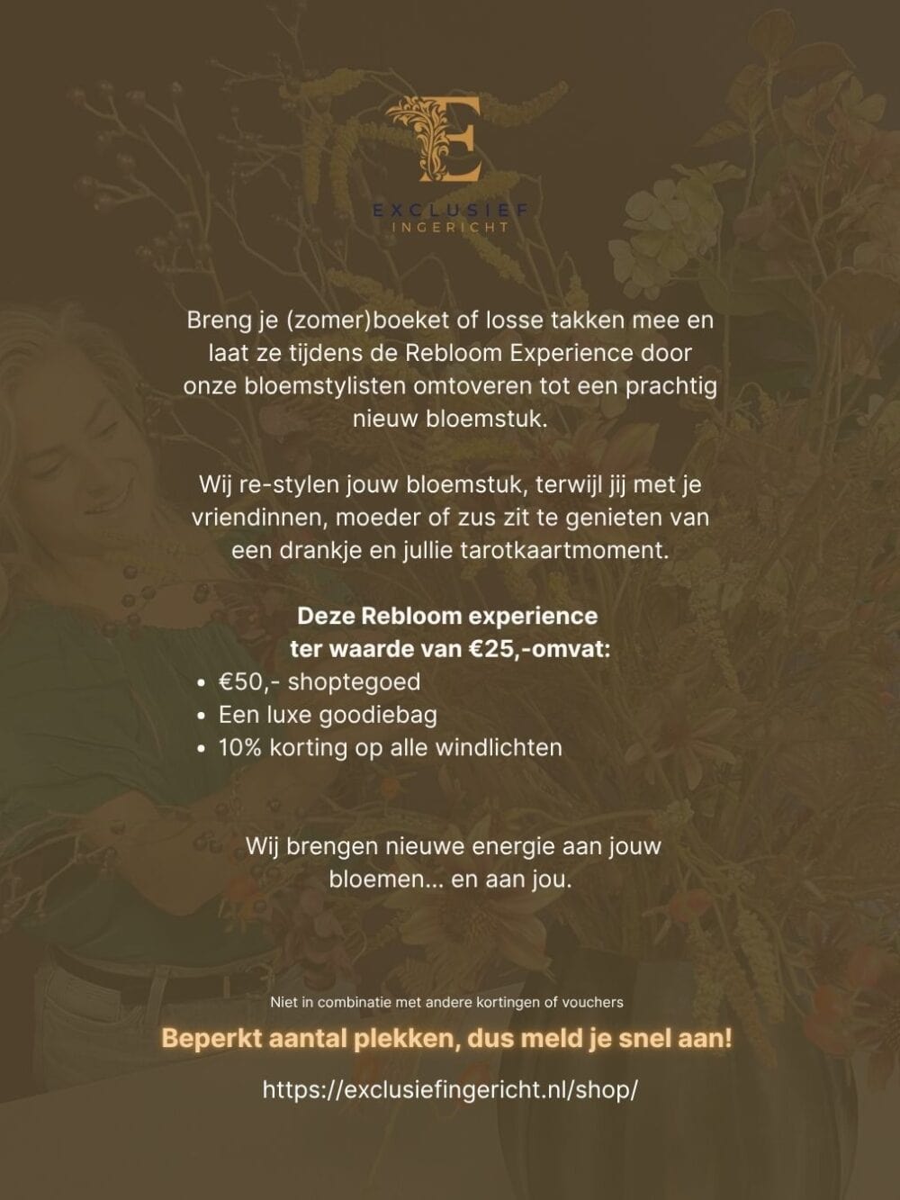 Breng je (zomer)boeket of losse takken mee en laat ze tijdens de Rebloom Experience door onze bloemstylisten omtoveren tot een prachtig nieuw bloemstuk. Wij re-stylen jouw bloemstuk, terwijl jij met je vriendinnen, moeder of zus zit te genieten van een drankje en jullie tarotkaartmoment. Deze Rebloom experience ter waarde van €25,-omvat: – €50,- shoptegoed -Een luxe goodiebag – 10% korting op alle windlichten Wij brengen nieuwe energie aan jouw bloemen… en aan jou.
