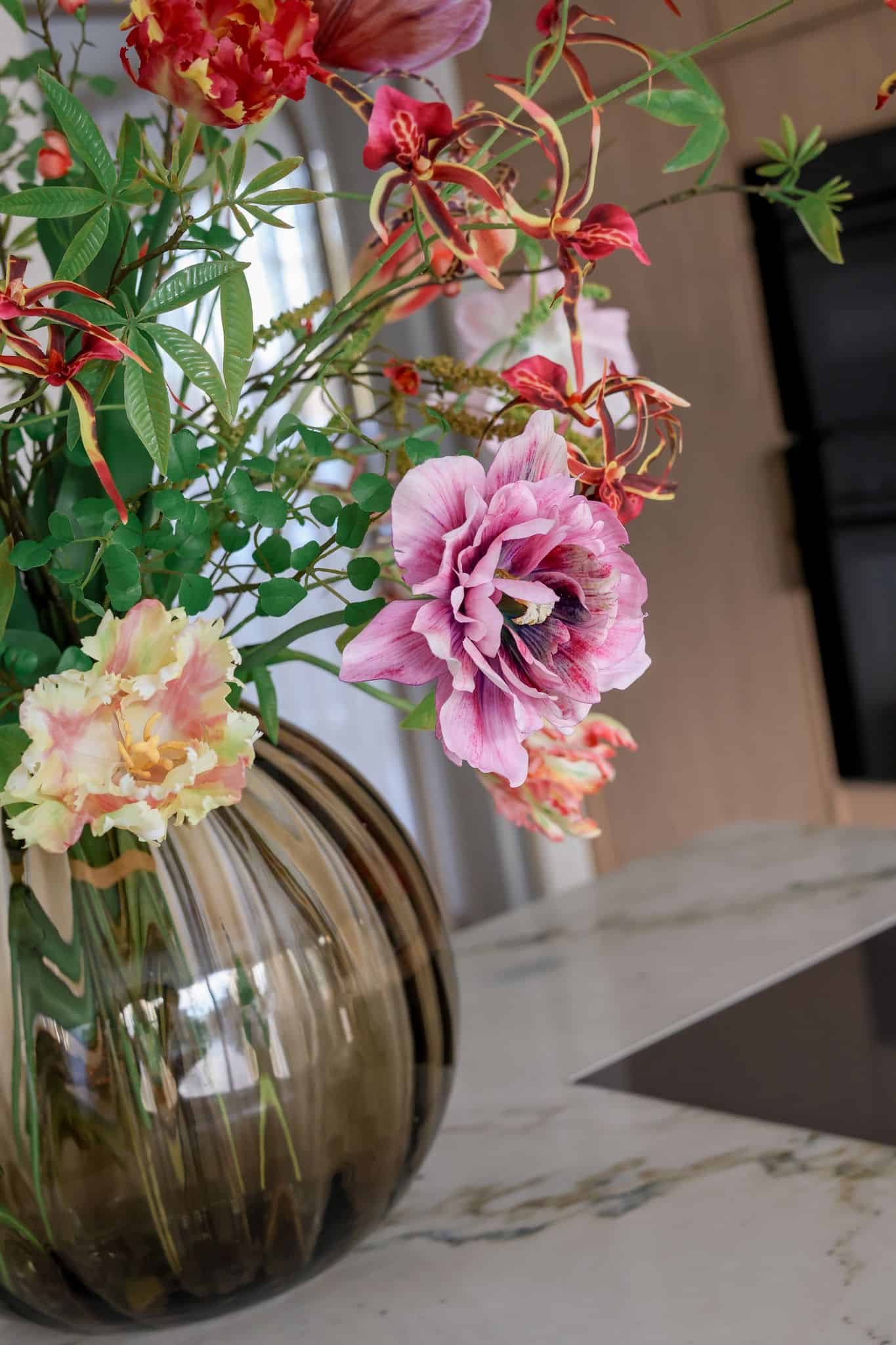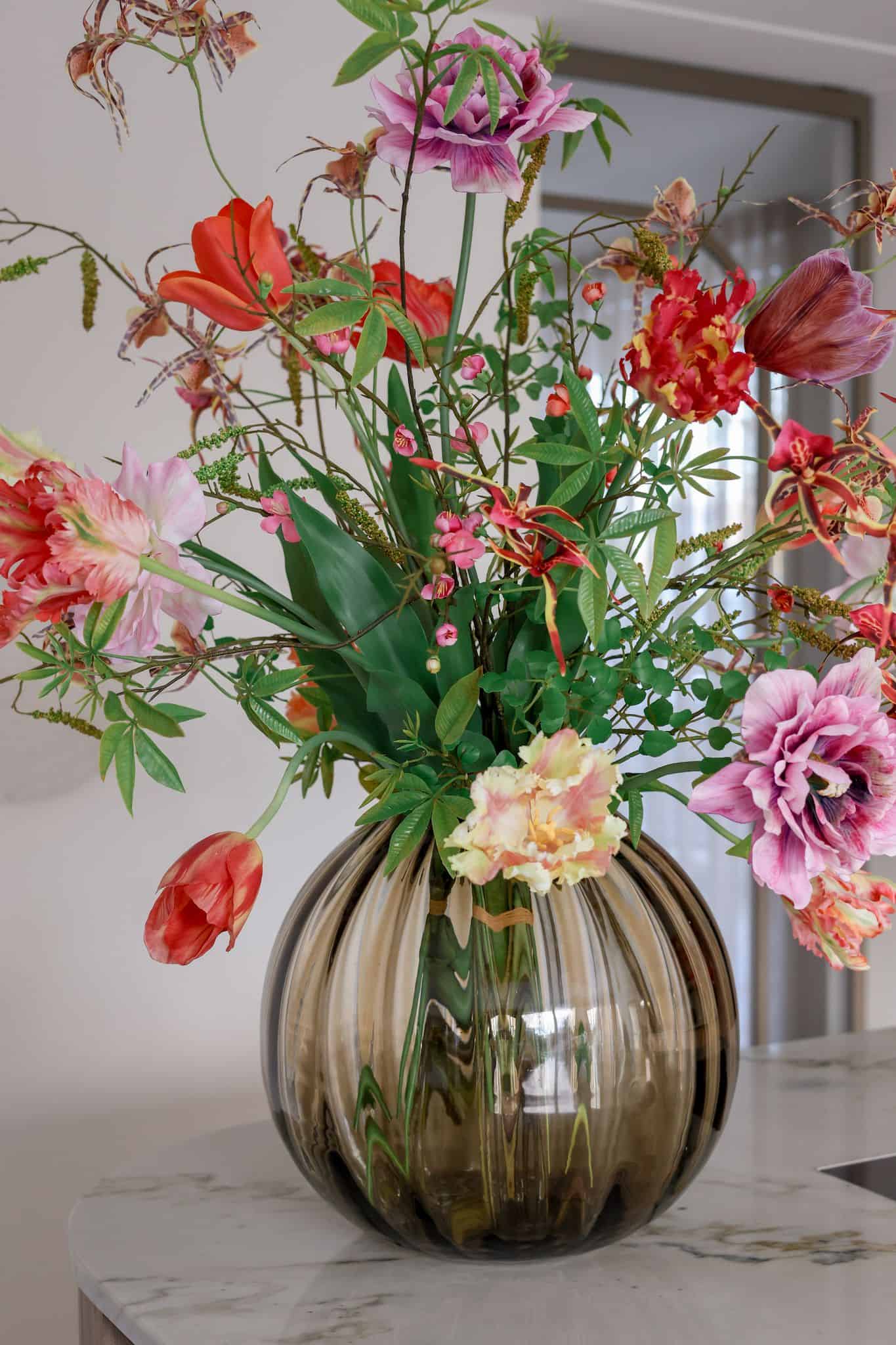 Sophie’s Choice Violet vraagt om een vaas die de elegantie ondersteunt: mat keramiek, helder glas of een zware voet in steengoed. Combineer het met zachte textielstructuren of een groene zijden tak voor een ingetogen stijlbeeld met maximale uitstraling.