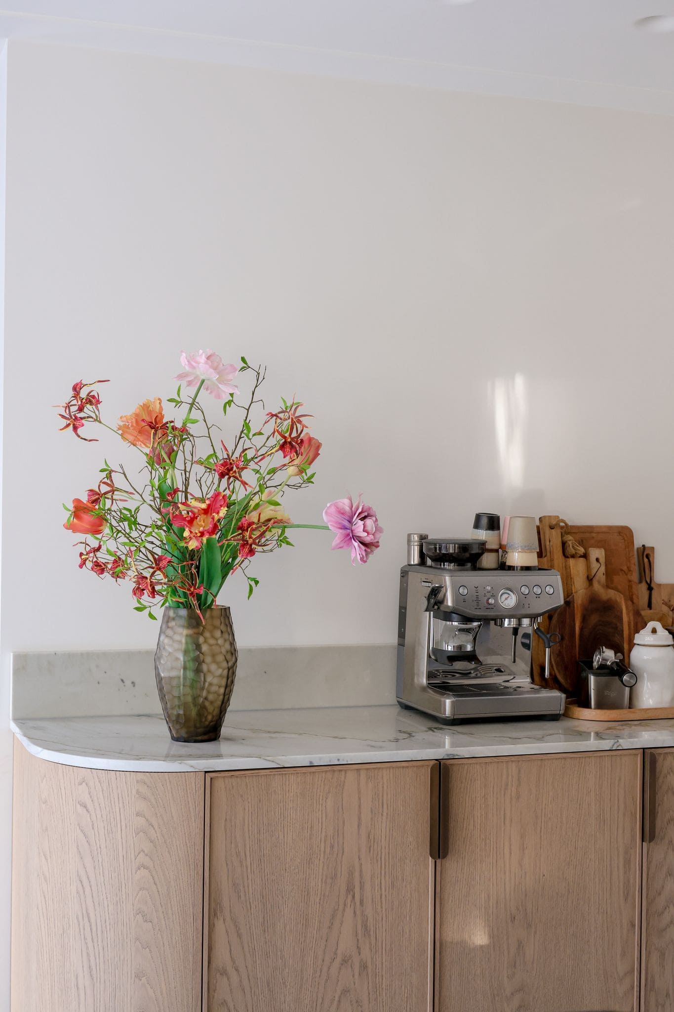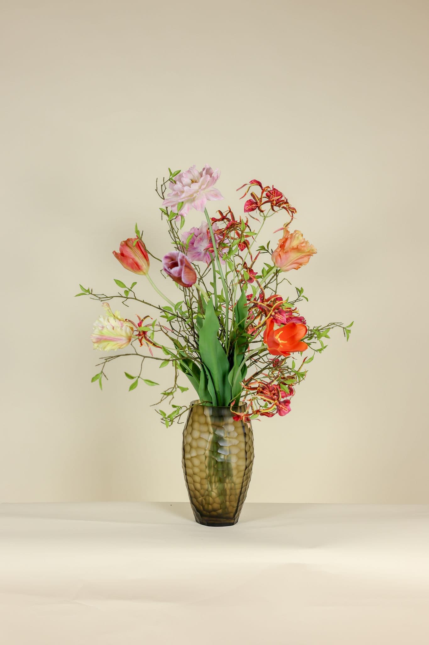 Stijltip: zet het boeket in een hoge, smalle vaas van rookglas en plaats het op een marmeren blad of een houten side table. Combineer met een kleine set stompkaarsen of een kunsttak eucalyptus voor extra sfeer.