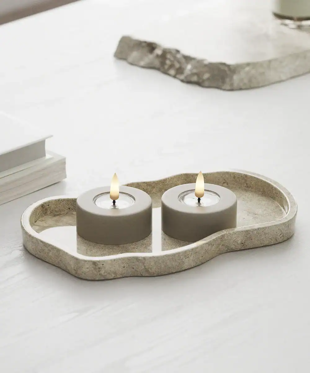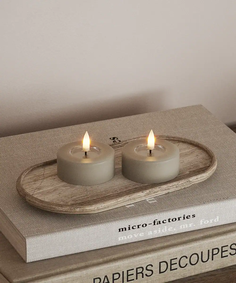 Gebruik twee zandkleurige led waxinelichtjes van dit formaat in lage windlichten op een marmeren tray, gecombineerd met een keramieken vaasje en een tak eucalyptus. Zet dit op een side table of vensterbank voor een zachte, uitnodigende sfeer. De warme zandtint houdt het geheel rustig en past zich aan naar elk moment van de dag.