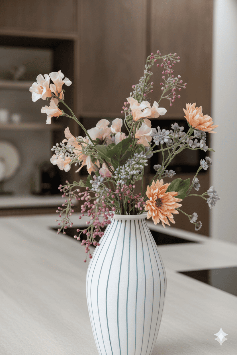 Dit arrangement past naadloos in interieurs met een romantische, klassieke of moderne stijl. In een minimalistisch interieur fungeert het als subtiele blikvanger, terwijl het in een rijk gedecoreerde woning juist voor luchtigheid zorgt. Door zacht avondlicht of kaarsen toe te voegen, krijgen de pastelkleuren een warme, bijna dromerige gloed.