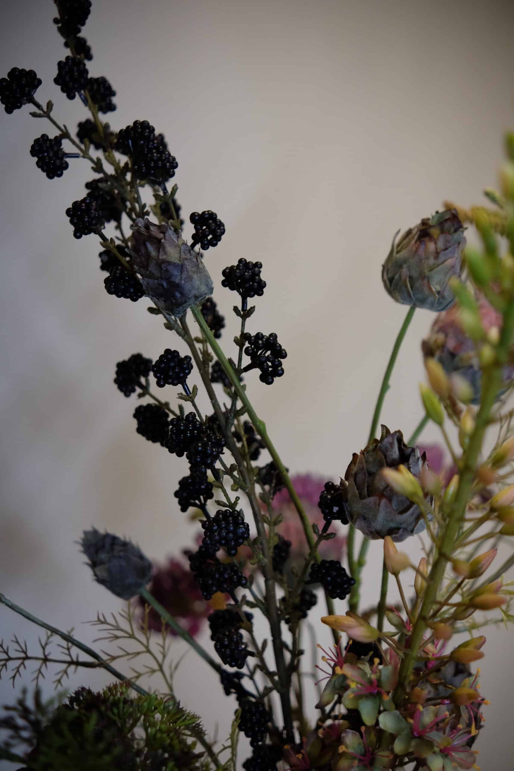Kies een vaas in zwart keramiek, donkerbruin glas of messing om de diepte van de bordeauxkleuren te versterken. Ook aardse kleuren zoals terracotta of zandsteen vormen een mooi contrast. Door het boeket te combineren met zachte materialen zoals wol of linnen ontstaat een spannend samenspel tussen stoer en zacht.