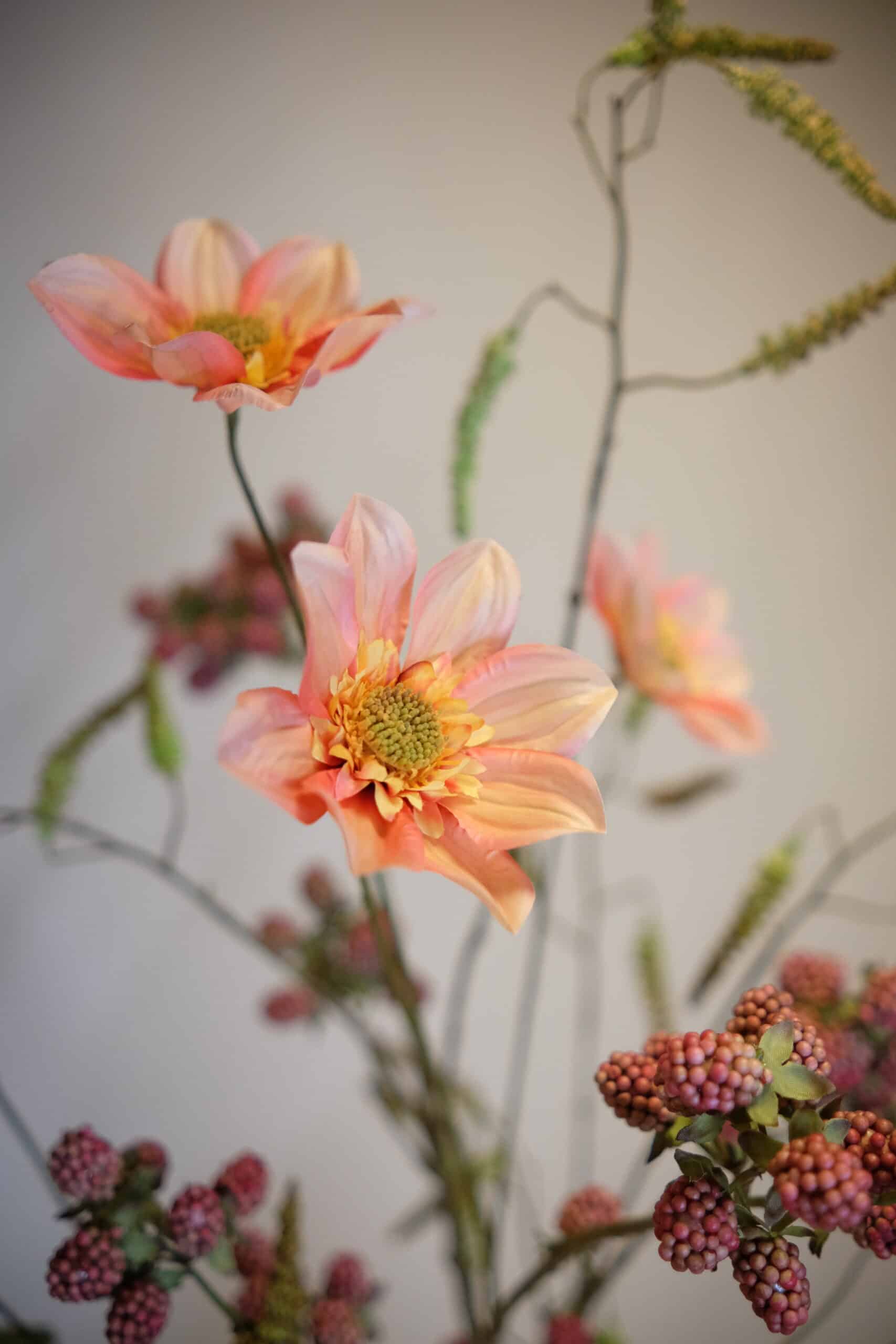 Je kunt hier ook jouw eigen boeket samenstellen. Misschien wil je de peachy tinten combineren met crèmekleurige bloemen, of met fijne groene zijden takken voor meer diepte. Onze stylisten helpen je daar graag bij, met oog voor jouw wensen en woonstijl.