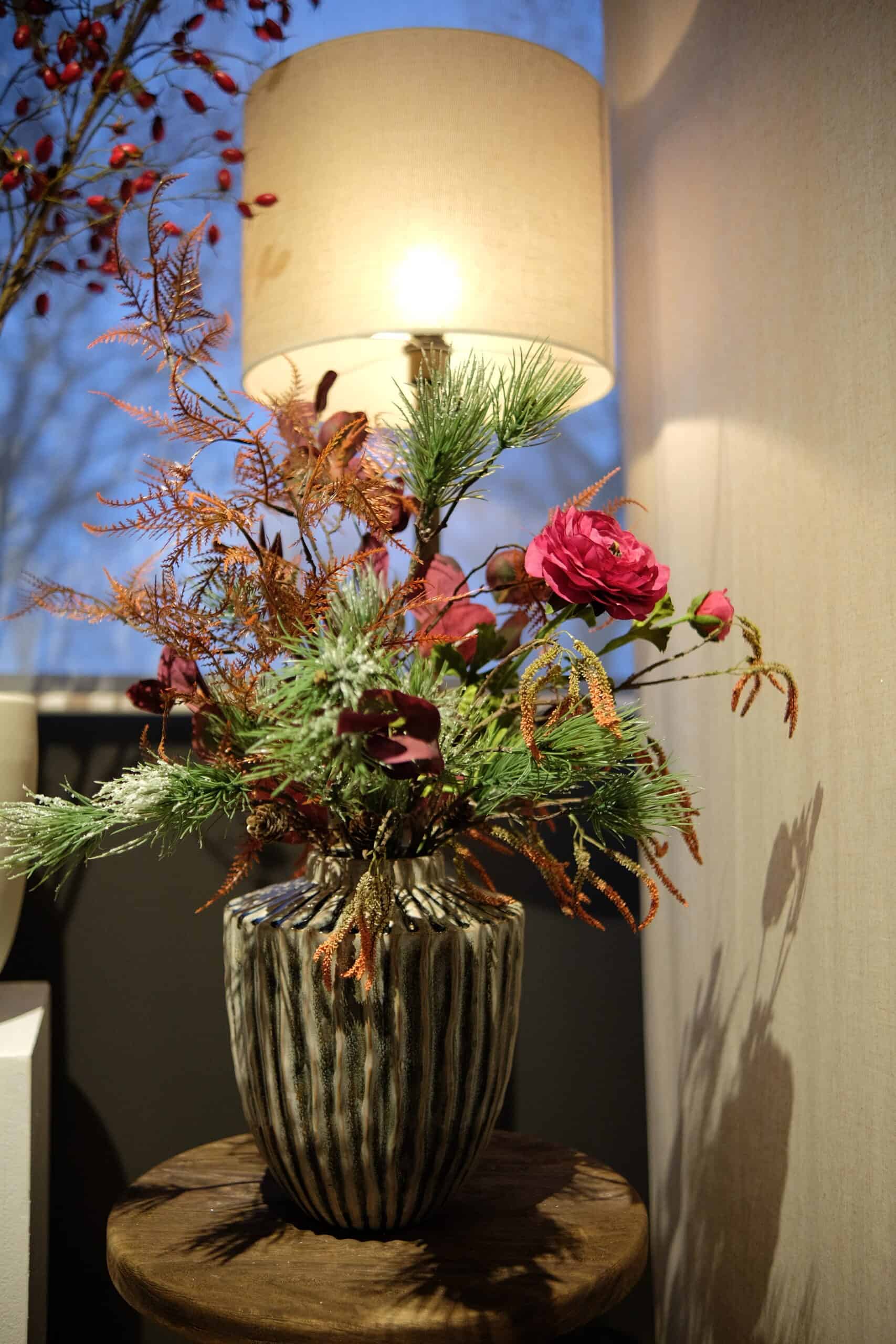 Het zijden kerstboeket Burgundy Green combineert de diepe warmte van bourgognekleurige bloemen met de frisse elegantie van rijke groentinten voor een luxueuze en harmonieuze wintercompositie. Dit hoogwaardige boeket straalt verfijning uit door de zorgvuldig gekozen zijden bloemen die samen een evenwichtige mix vormen van diepte, rust en feestelijke allure. De diepe burgundykleuren geven een chique en moderne uitstraling terwijl de groene accenten voor frisheid en natuurlijke balans zorgen. Dankzij de realistische texturen en subtiele glans ontstaat een winterse luxe die zowel in moderne interieurs als in klassieke woonstijlen volledig tot zijn recht komt. Burgundy Green is ideaal als statement piece op een dressoir, salontafel of dining area en blijft door de duurzame zijdekwaliteit seizoen na seizoen prachtig zonder onderhoud. Het boeket brengt de schoonheid van een winterse bosrijke sfeer naar binnen maar dan in een hoogwaardige, tijdloze uitvoering. Voor iedereen die houdt van een rijke kleurencombinatie met een exclusieve uitstraling vormt dit zijden kerstboeket de perfecte keuze. Het geeft iedere ruimte direct een warme en elegante kerstsfeer die blijvend tot zijn recht komt.