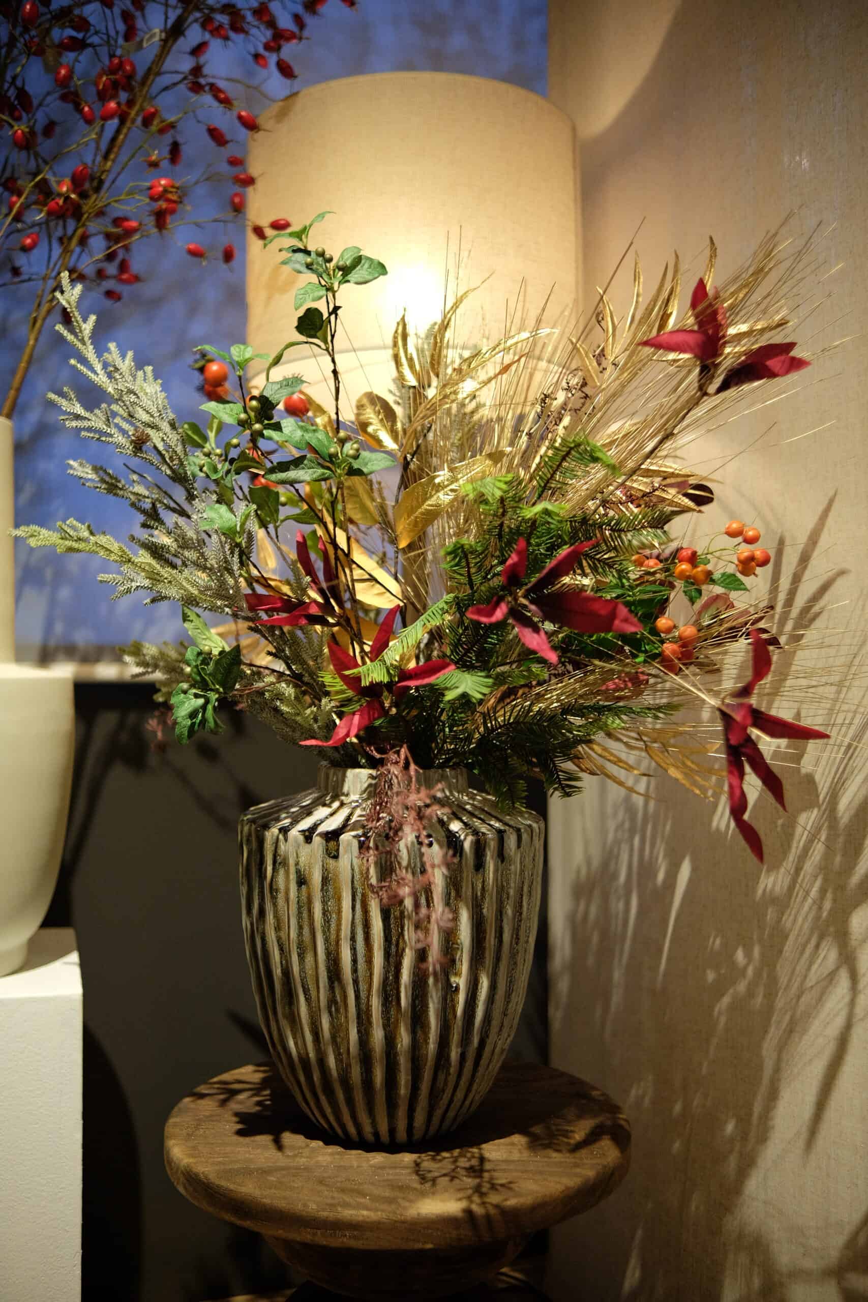 Het zijden kerstboeket Golden Christmas brengt een warme en luxueuze feestuitstraling in huis dankzij de combinatie van rijke goudtinten, zachte crèmekleuren en subtiele wintergroenen. Dit exclusieve boeket is samengesteld uit hoogwaardige zijden bloemen die een uitzonderlijk elegante glans hebben waardoor elke bloem een verfijnde diepte en allure toont. De gouden accenten zorgen voor een sprankelende feestelijkheid die onmiddellijk een chique kerstsfeer creëert zonder overheersend te worden. Golden Christmas past moeiteloos in zowel moderne als klassieke interieurs en vormt een stijlvol pronkstuk op een dressoir, eettafel of entree. De realistische afwerking geeft het boeket een natuurlijke uitstraling die seizoen na seizoen mooi blijft zonder onderhoud. De combinatie van zachte tonen, feestelijke lichtreflectie en royale vormen maakt dit boeket ideaal voor iedereen die een harmonieuze en luxe kerstsfeer wil neerzetten. Golden Christmas belichaamt de elegantie van de feestdagen en brengt een tijdloze glans die elke ruimte transformeert in een warme en uitnodigende omgeving.