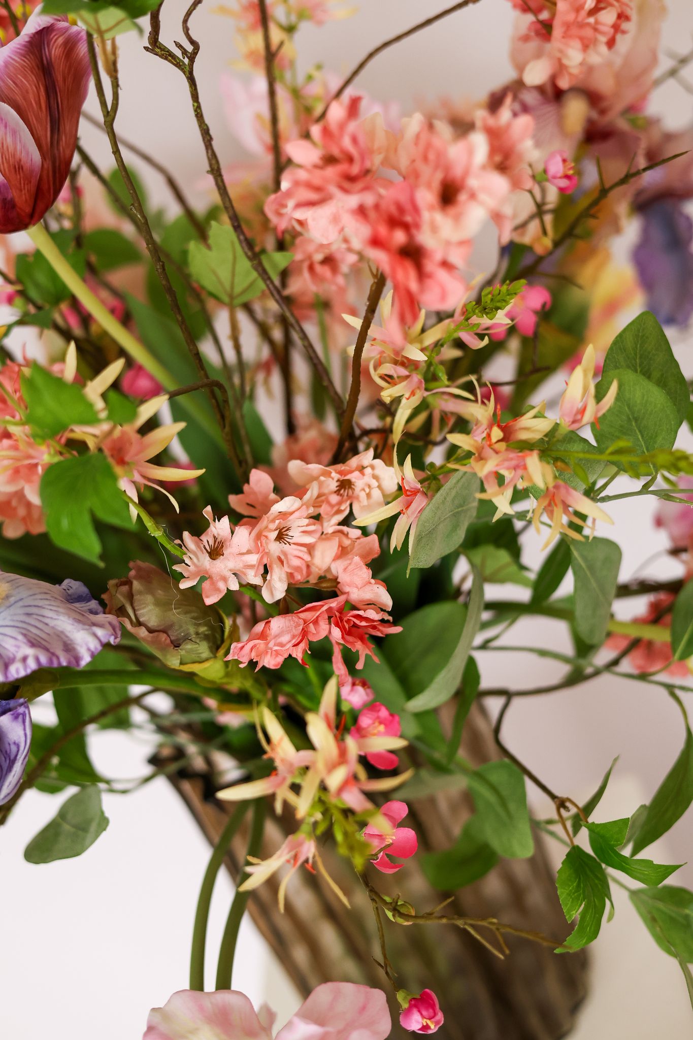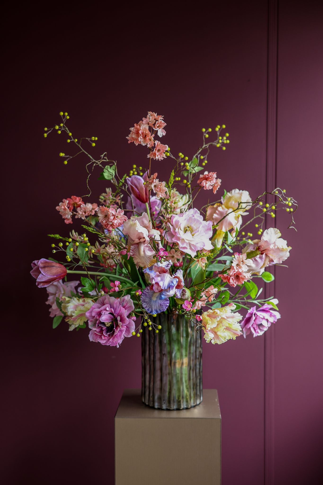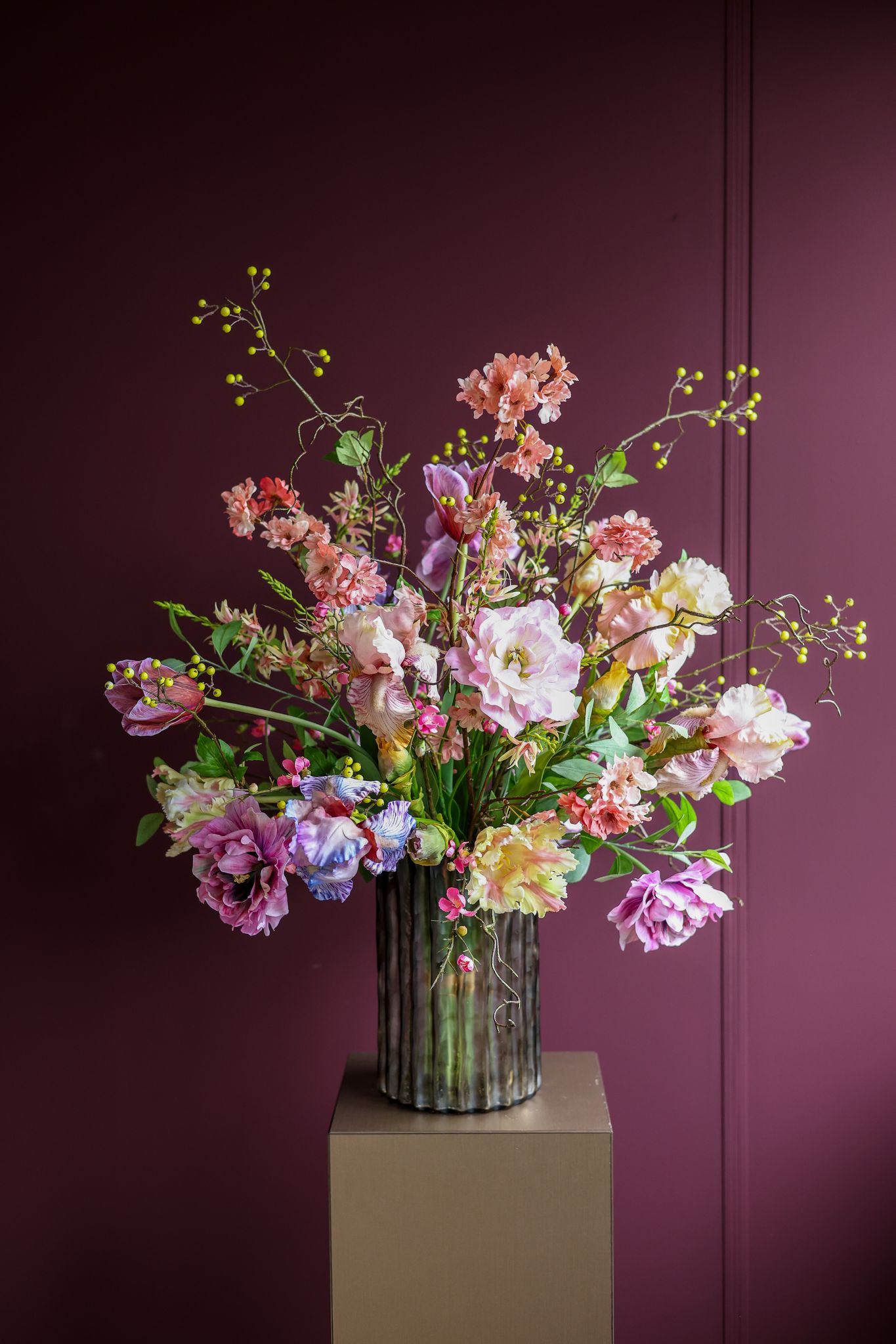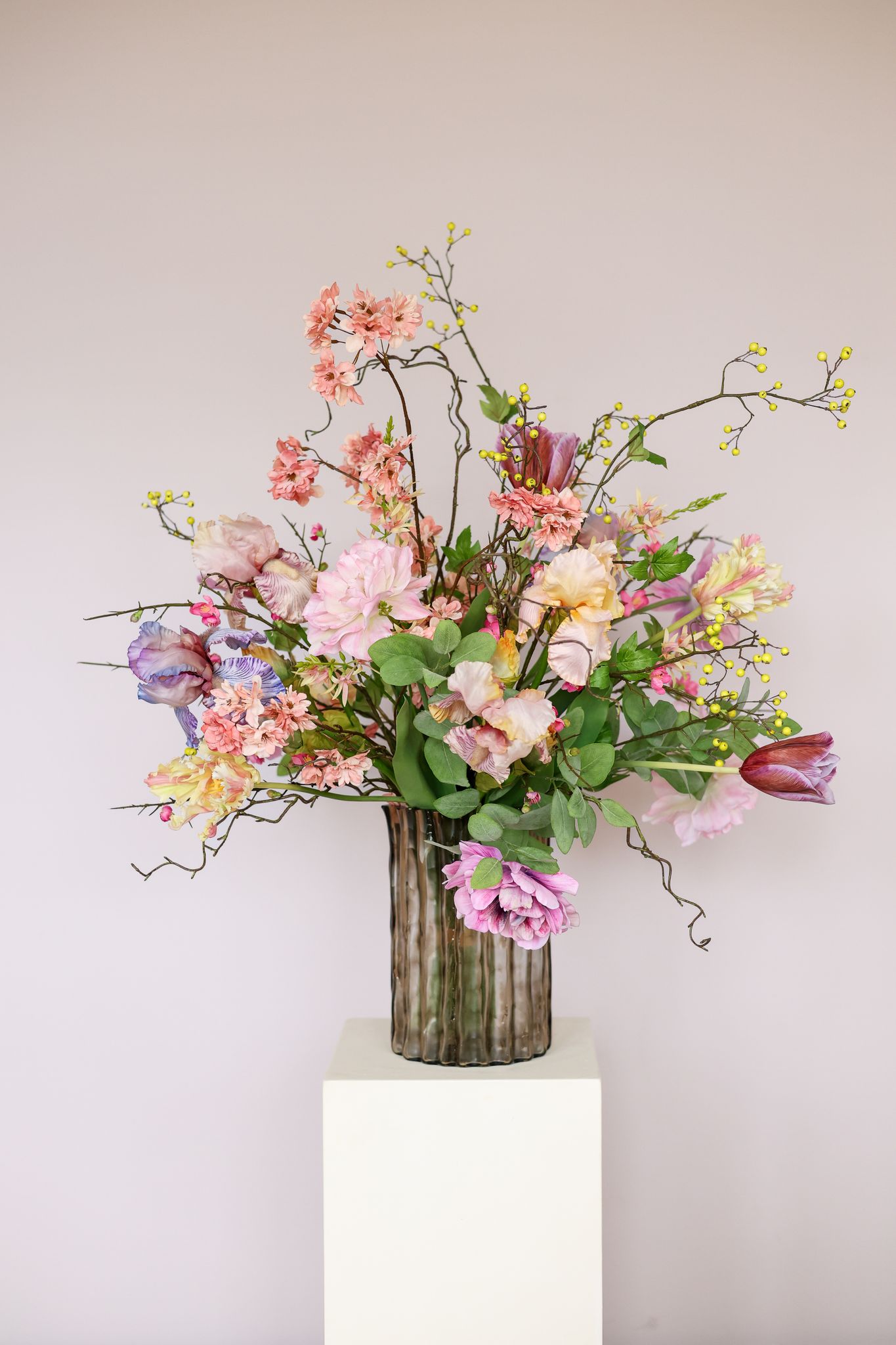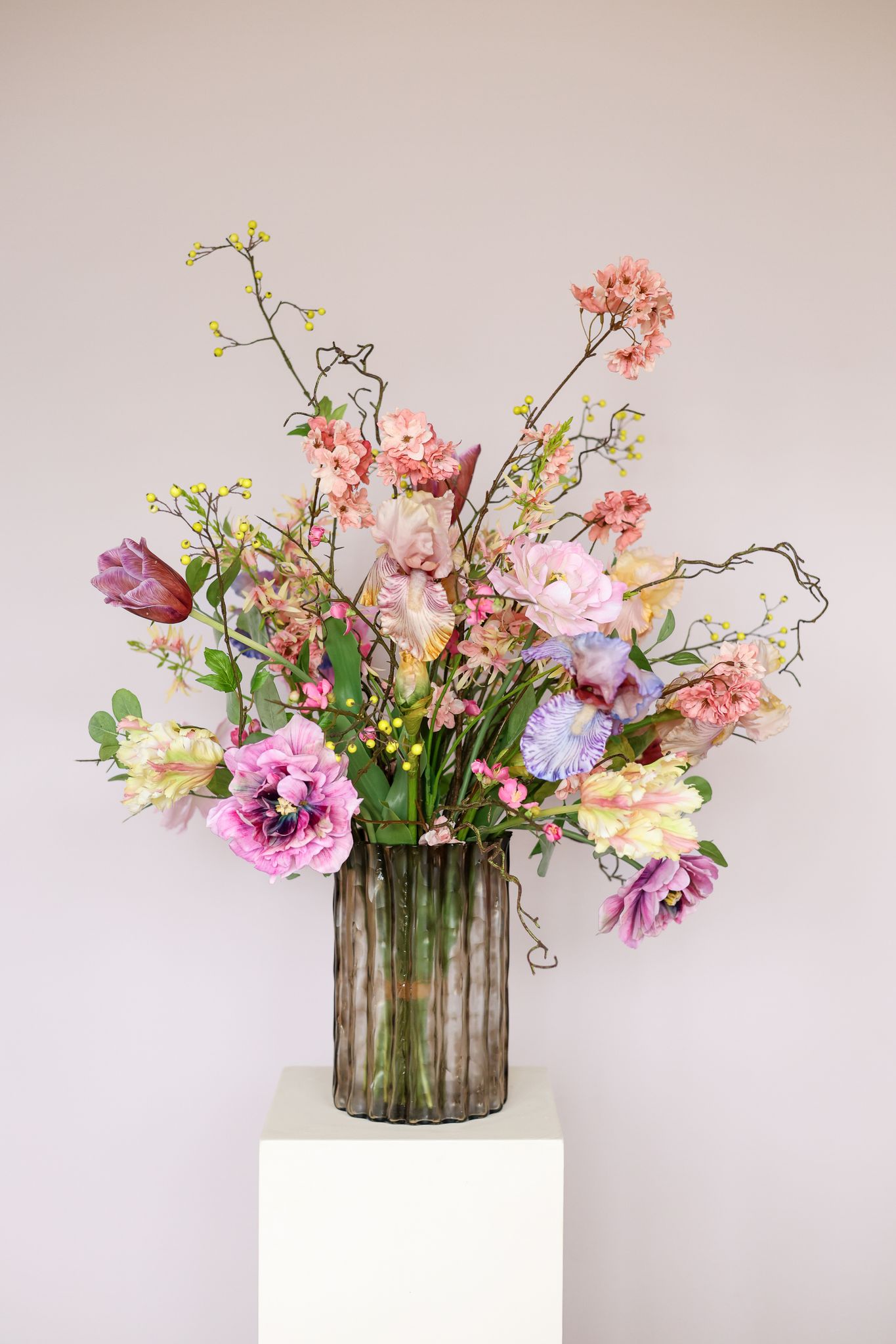 Wat dit boeket onderscheidt, is de combinatie van zachte kleurtinten met een royale opbouw. De tulpen bewegen zich in een verfijnd palet van zachtroze, perzik, lila en ivoorwit, waardoor een gelaagd en harmonieus geheel ontstaat. Door het formaat krijgt deze zachte kleurstelling juist extra kracht en aanwezigheid, zonder overheersend te worden. Het resultaat is een luxe blikvanger die direct klasse toevoegt aan het interieur.