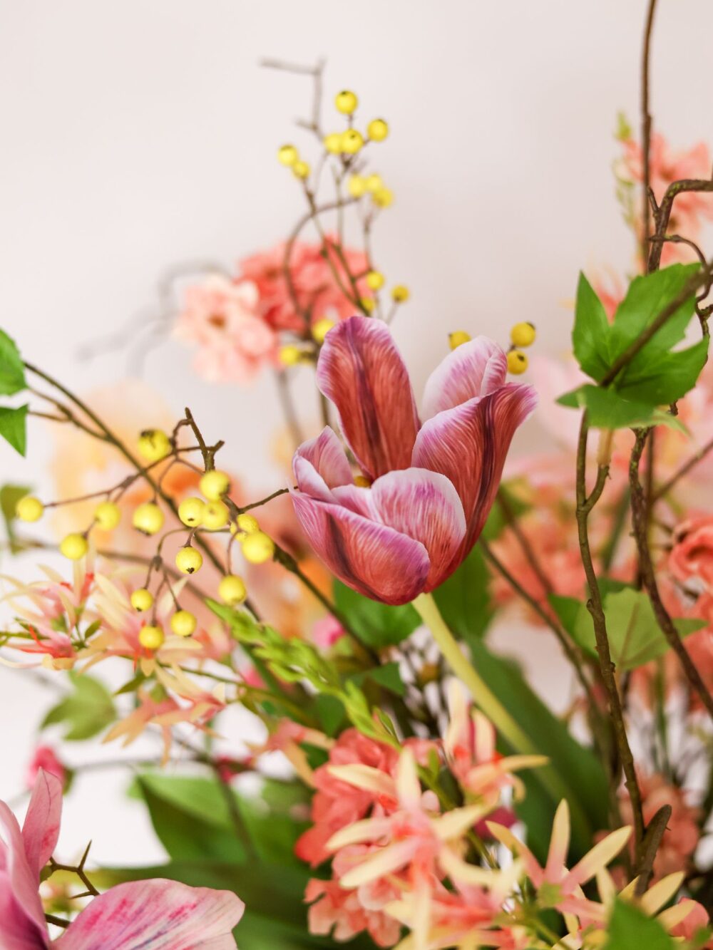 Elke tulp binnen Sophie’s Choice is vervaardigd met oog voor detail. De bloemblaadjes hebben een subtiele structuur en een lichte zijdeglans die het natuurlijke karakter versterkt. De stelen zijn stevig maar flexibel, waardoor het boeket een losse, organische vorm krijgt. Dit voorkomt een statisch effect en zorgt voor een levendige, realistische uitstraling die past binnen een high end interieur.
