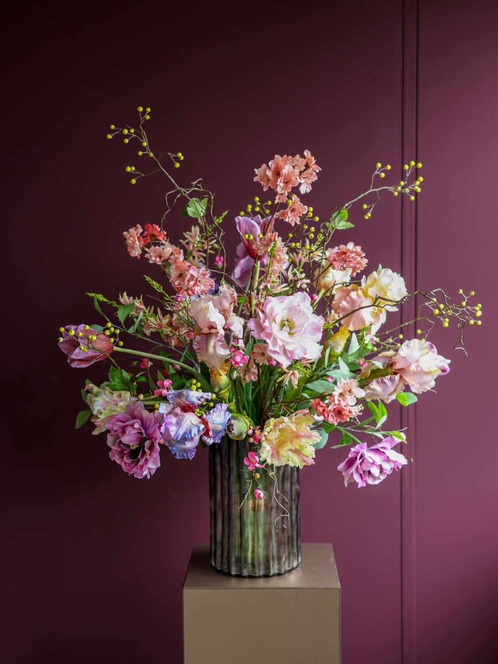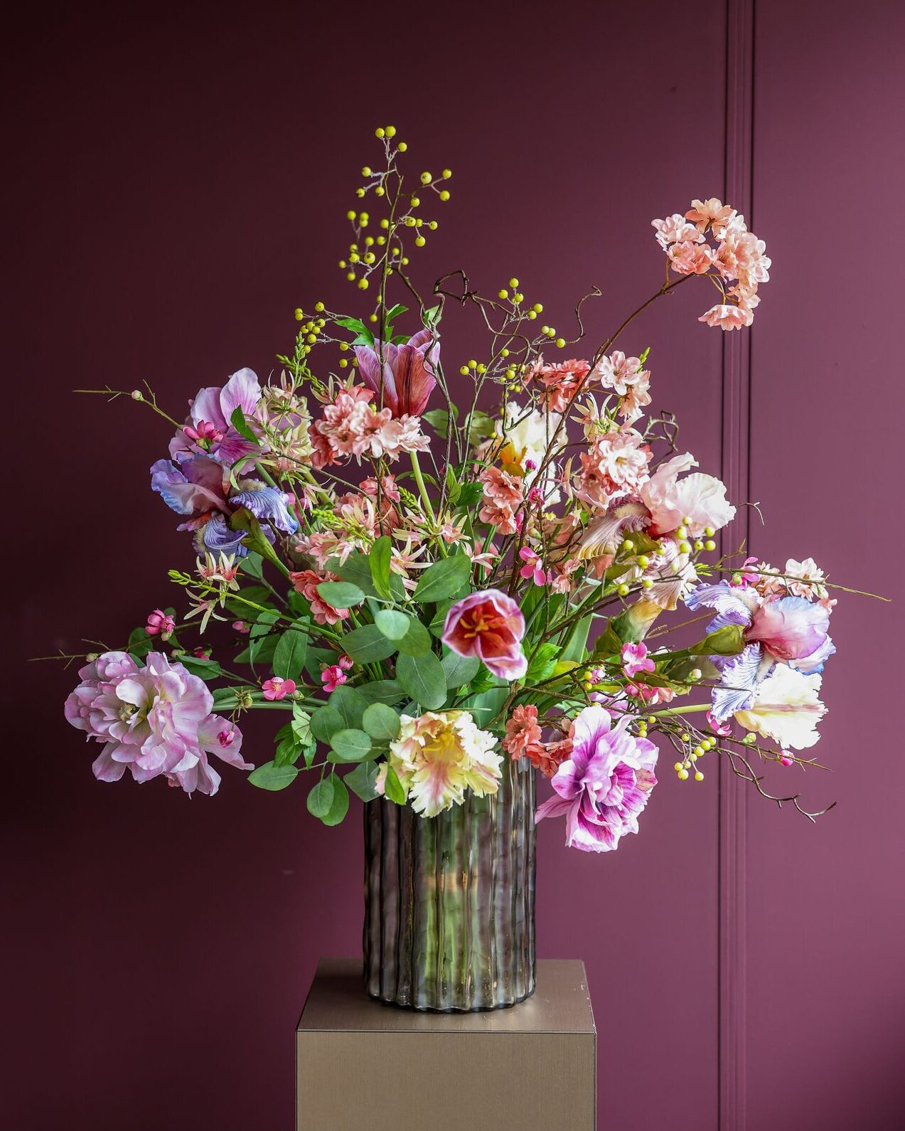 Door de hoogte van 110 cm komt dit boeket het best tot zijn recht op plekken waar schaal belangrijk is. Denk aan een grote eettafel, een ruim dressoir, een entree of een kookeiland. Ook in een hoge vaas op de vloer creëert het een indrukwekkend verticaal element dat de ruimte optisch versterkt. Dit boeket vult niet alleen ruimte, het geeft richting aan de styling van de hele omgeving.