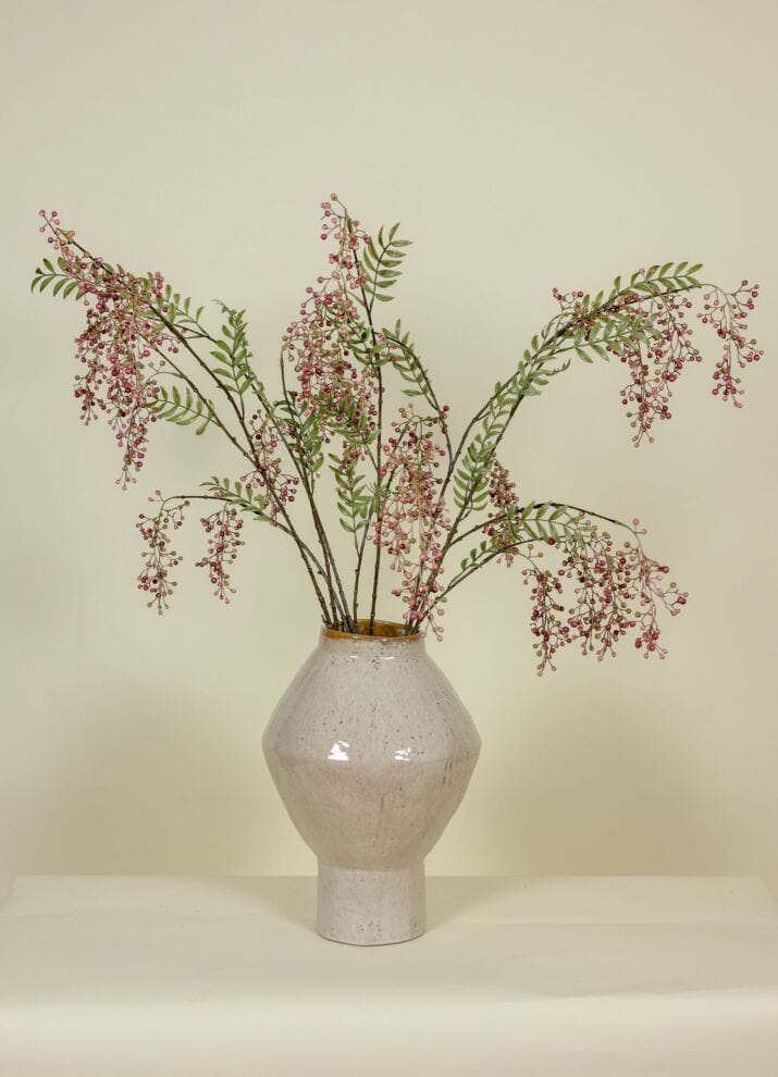 De speelse vertakkingen en het natuurlijke volume geven het boeket een elegante, luchtige uitstraling. In een middelhoge vaas komt het zijden boeket Bessentak roze deluxe prachtig tot zijn recht als stijlvolle eyecatcher op een salontafel, dressoir of keukentafel. De flexibele stelen zorgen ervoor dat je het boeket eenvoudig in model kunt brengen en eventueel kunt combineren met andere zijden bloemen voor een nog luxere uitstraling.