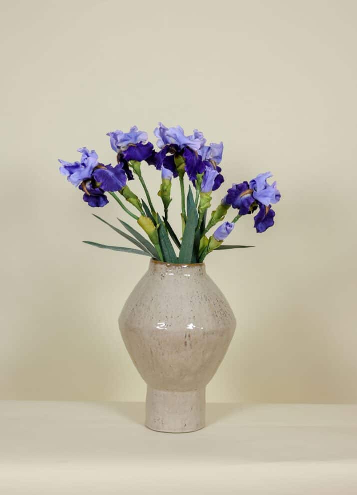 Het zijden boeket Iris paars bestaat uit prachtige, natuurgetrouw vormgegeven irissen met rijke paarstinten en subtiele kleurverlopen. De bloembladen hebben een zijdeachtige structuur waardoor de irissen licht en levensecht ogen. De combinatie van diepe paarsnuances en frisse accenten maakt dit boeket een stijlvolle toevoeging aan moderne, romantische en luxe interieurs.