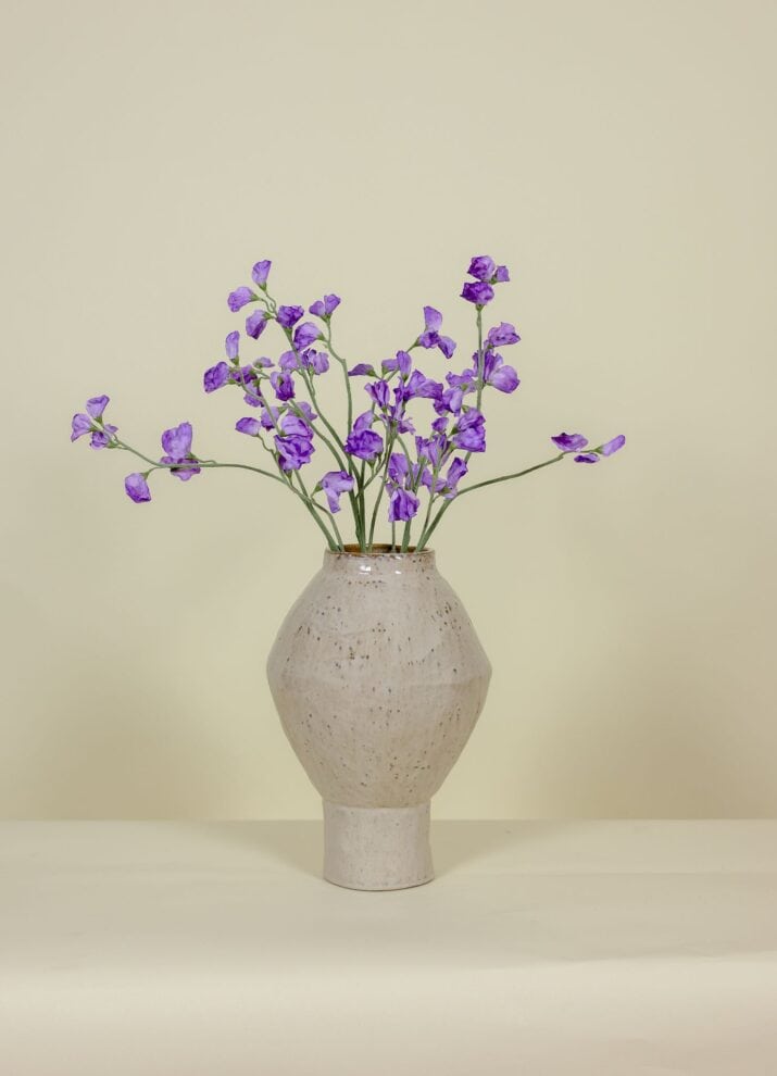 Het zijden boeket Pronkerwt paars bestaat uit verfijnde pronkerwtbloemen met zachte, golvende bloemblaadjes. De elegante overgangen van licht- naar diep paars zorgen voor een rijk en expressief kleurbeeld. De zijdeachtige structuur geeft de bloemen een realistische, luchtige uitstraling die bijna niet te onderscheiden is van echte pronkerwt.