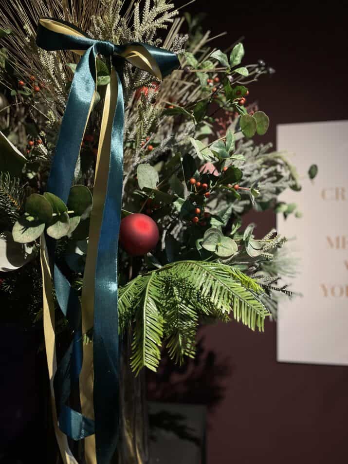 zijden kerstboeket Signature Christmas is een luxe zijden kerstboeket met zachte crèmekleuren en sprankelende gouden accenten dat elke ruimte een warme, elegante en feestelijke glans geeft die blijvend mooi blijft.